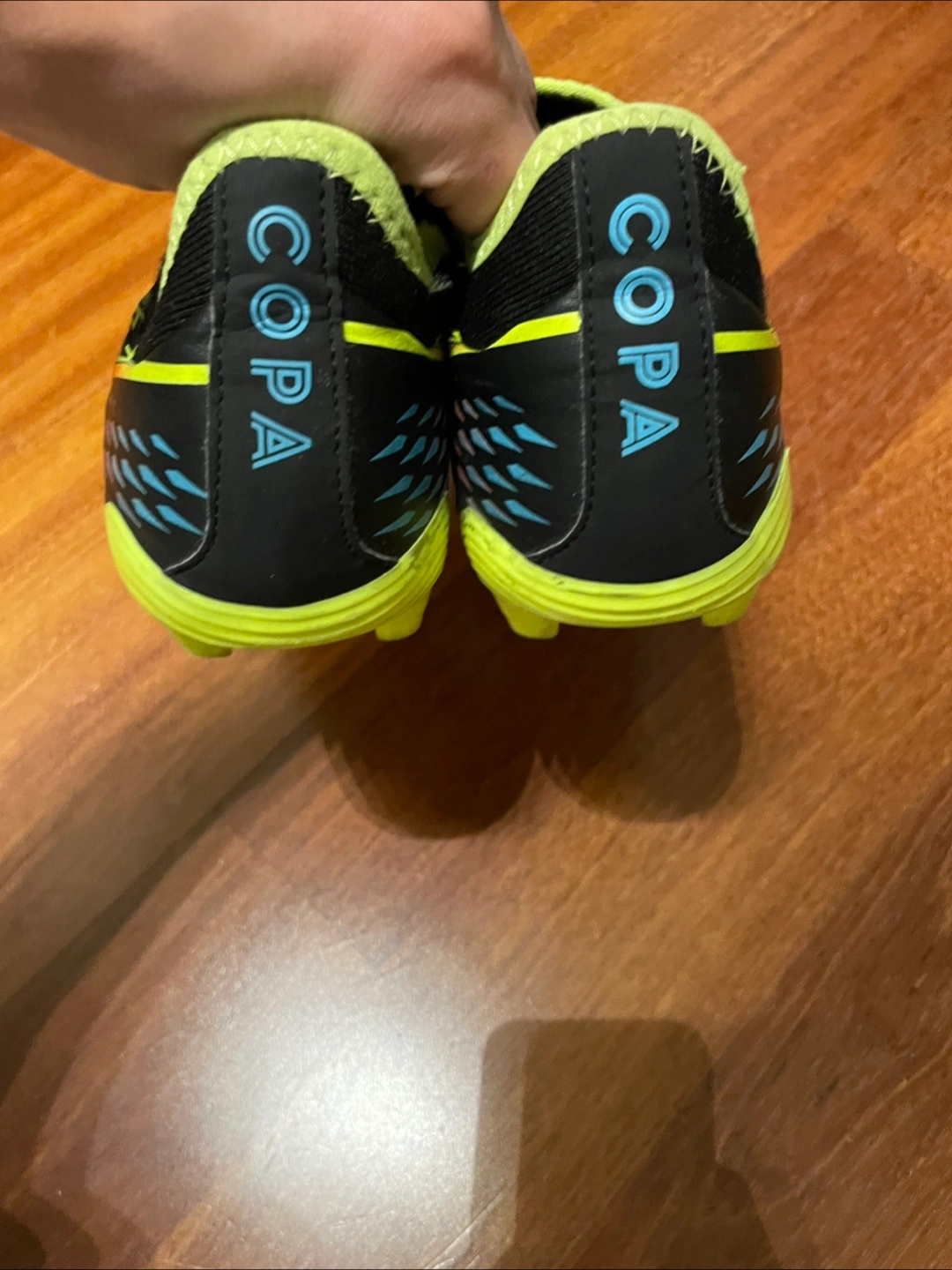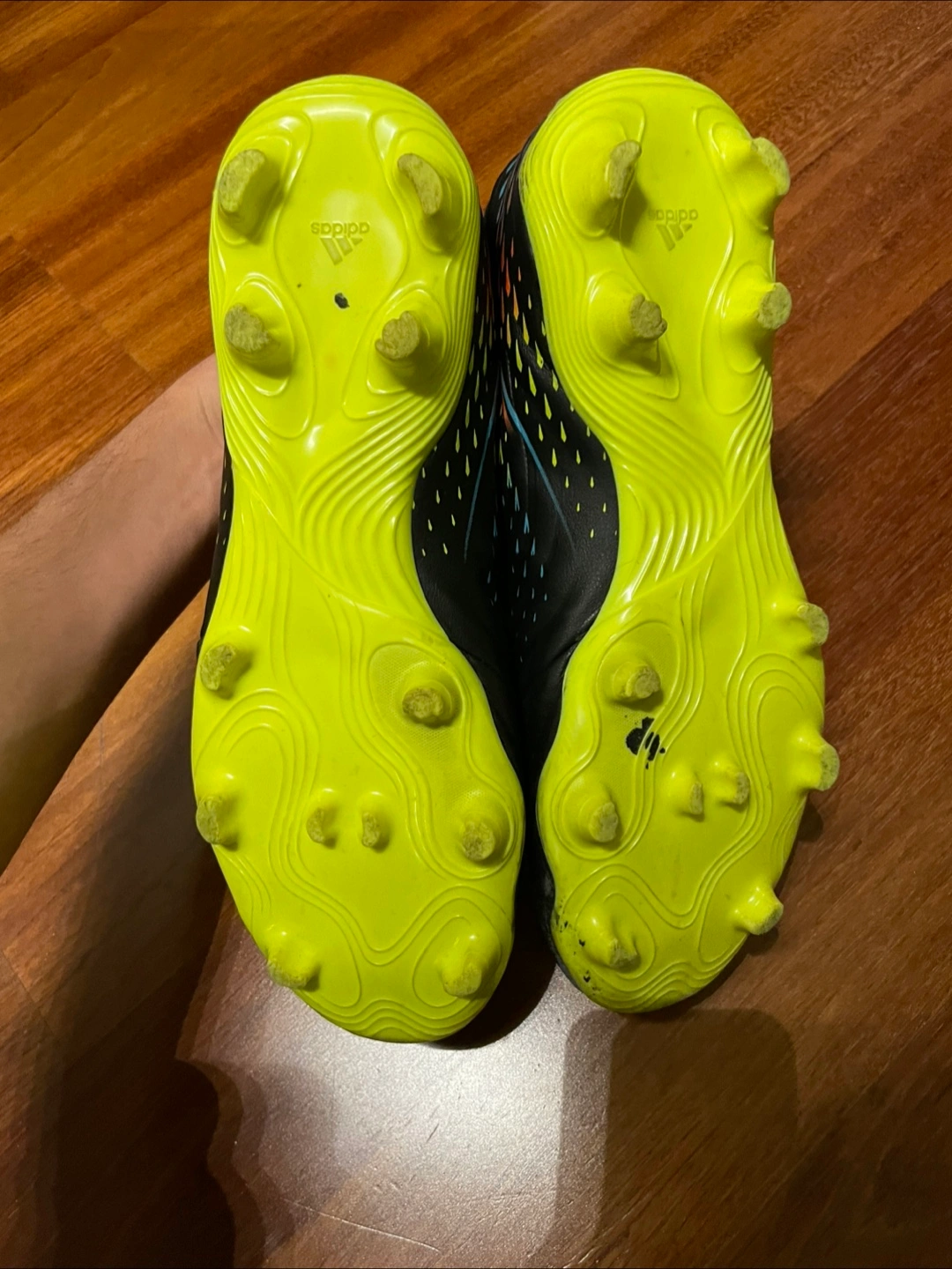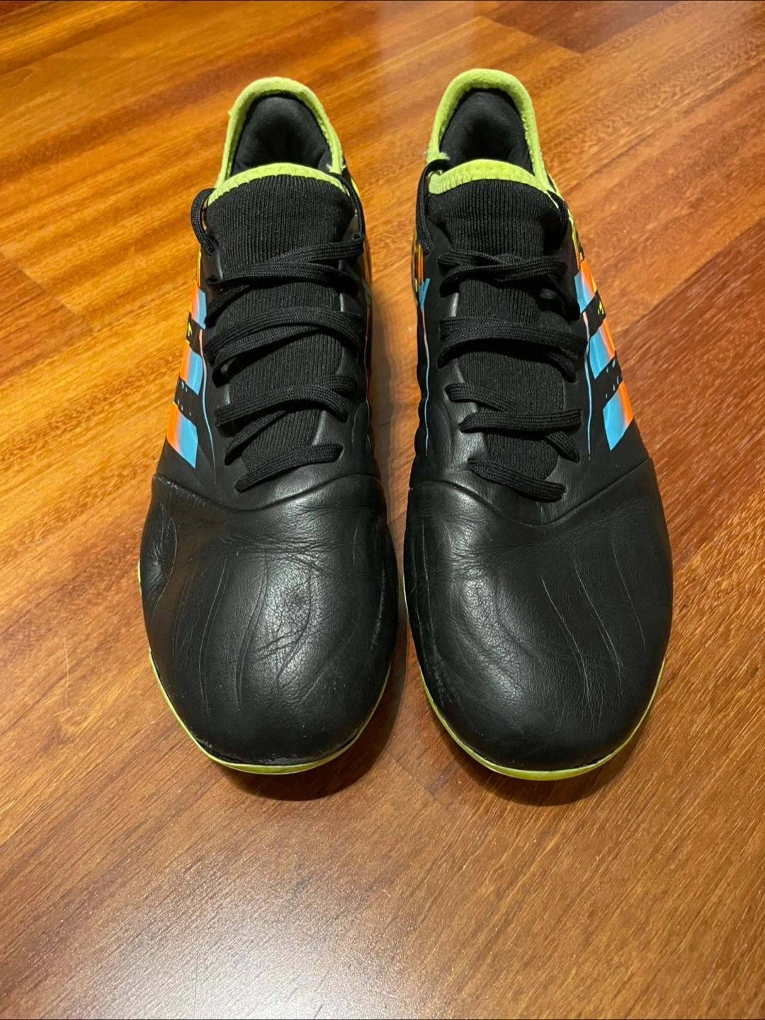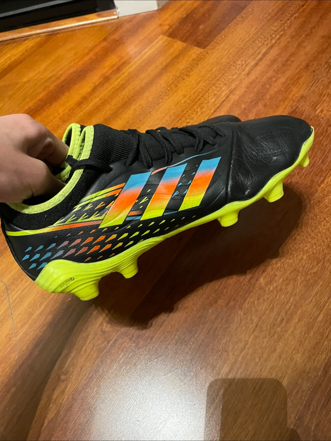 Selling a pair of Adidas Copa soccer cleats. They're black with colourful stripes and neon yellow soles. Size 9.