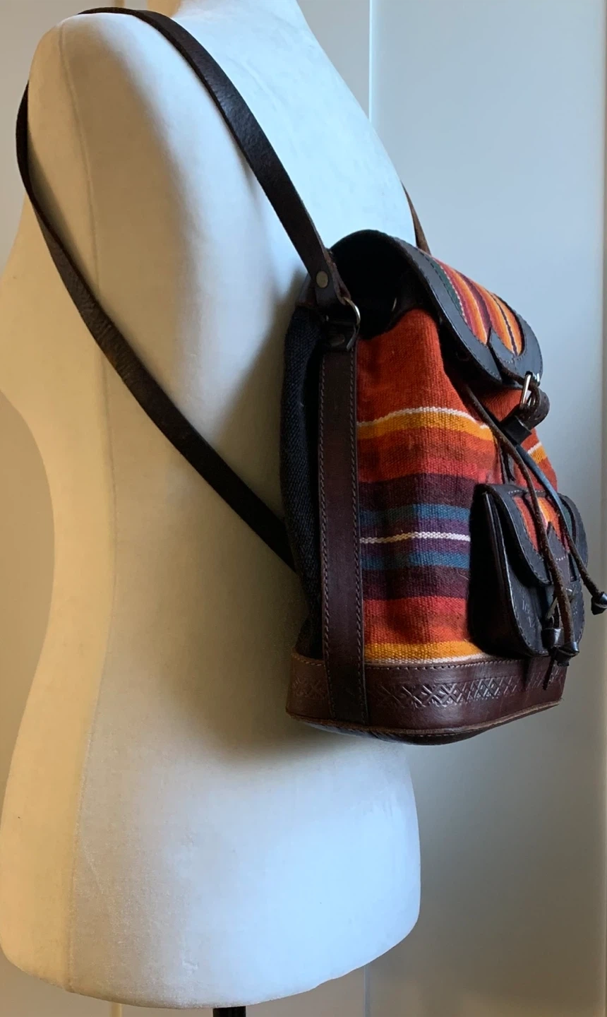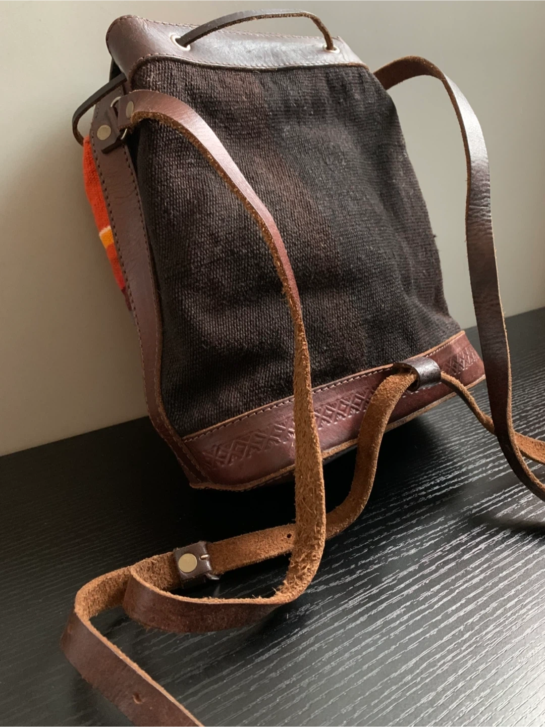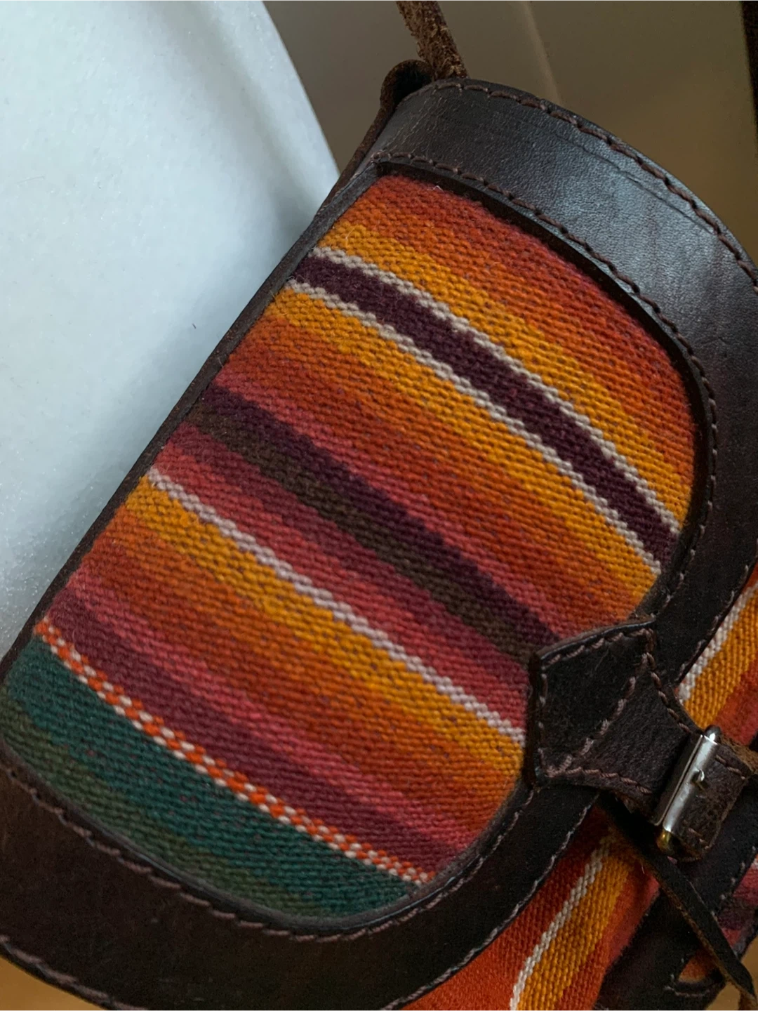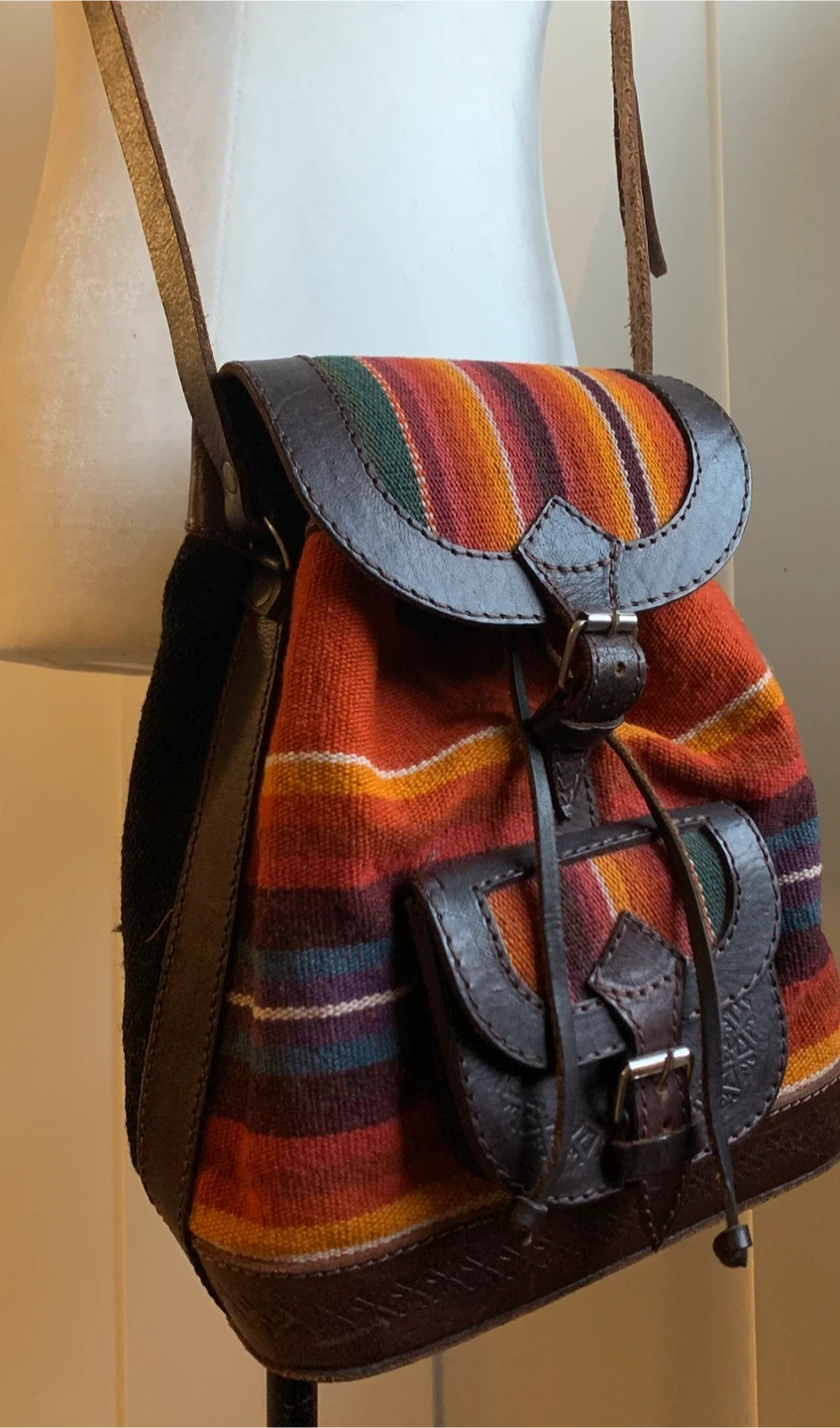 •Striped woven pattern and brown leather accents. It has a small pocket on the front and adjustable straps.