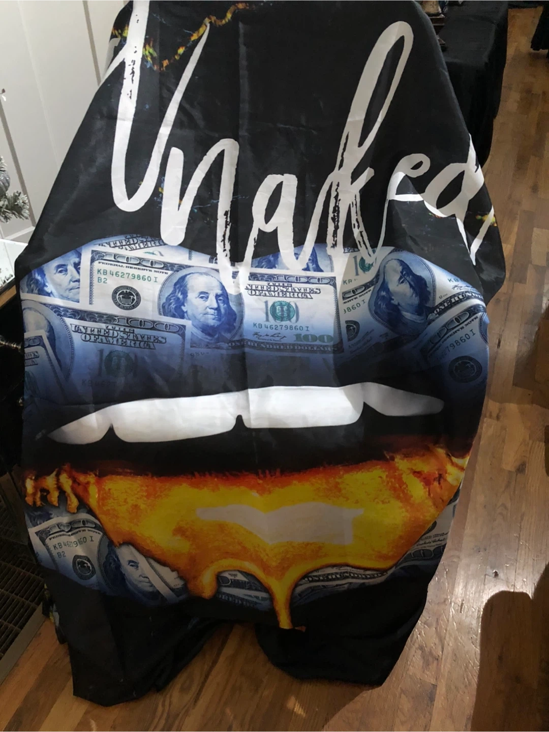 This is a cloth featuring a unique design with the word "Unaked", lips, and money. It's a statement piece that could add some edge to any space or project!