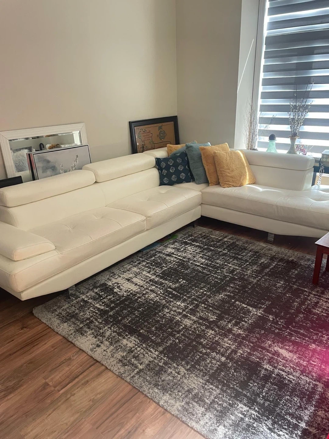 Selling a comfortable white leather sectional sofa. It's in good condition and would be a great addition to any living room. Perfect for lounging and relaxing after a long day!