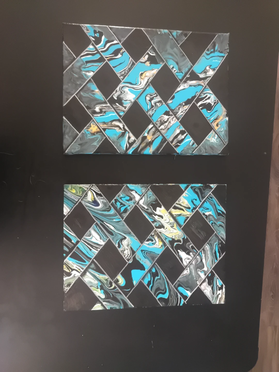 Two unique, handmade abstract paintings! They feature a cool geometric pattern with shades of blue, grey, and white on a black background. Perfect for adding a modern touch to any room