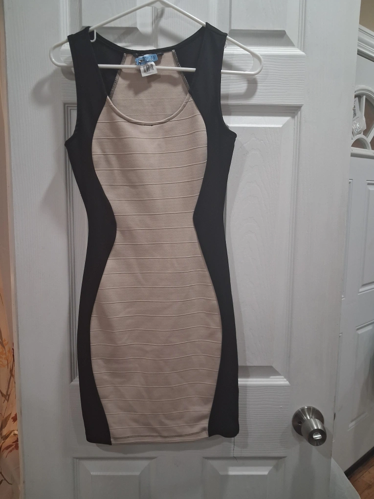 This is a stylish bebe bandage dress in black and beige. It's perfect for a night out or a special occasion. The dress is in good condition and ready for a new owner! The material is a comfortable and stretchy bandage fabric.