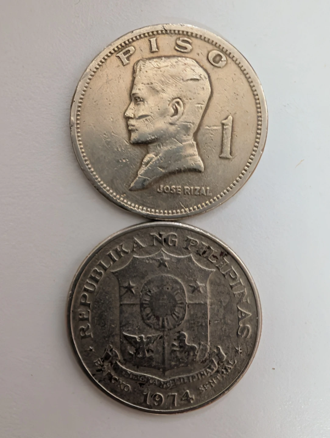 Selling a vintage Philippine Piso coin from 1974. It features Jose Rizal and the coat of arms of the Philippines. A great piece for collectors!