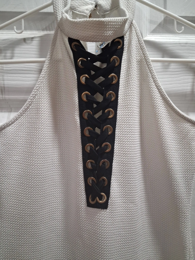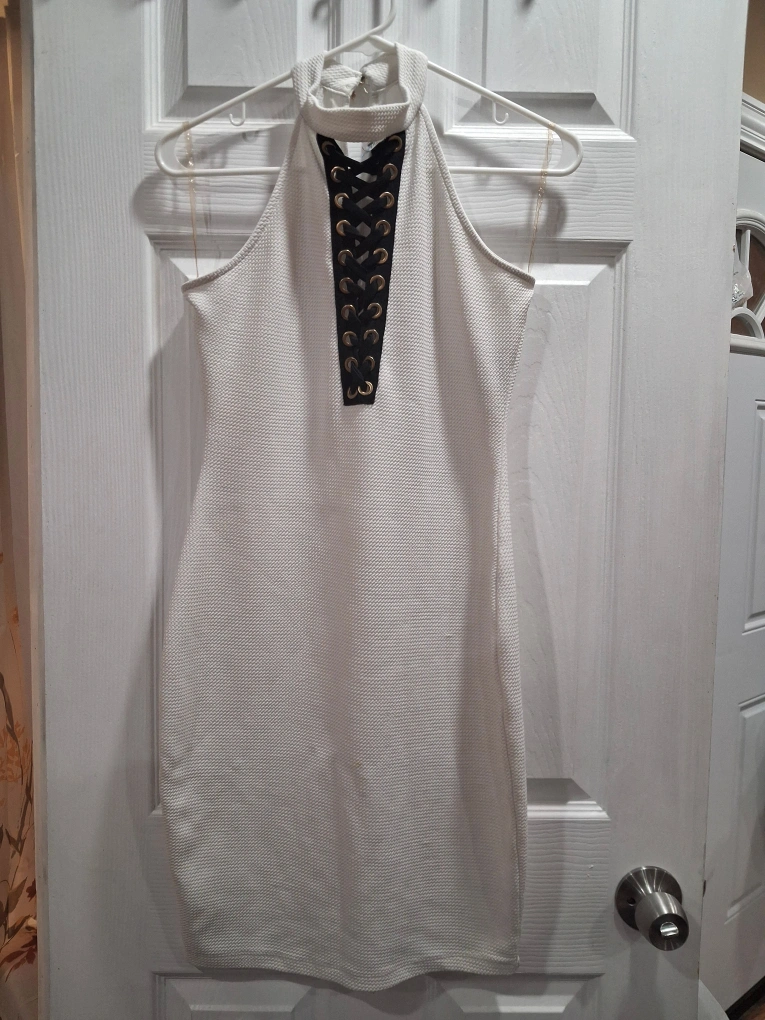 Selling a cute white halter mini dress! It features a unique lace-up detail at the neckline. Perfect for a night out or a special occasion