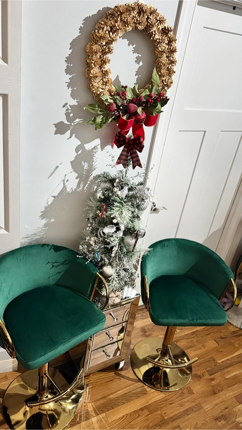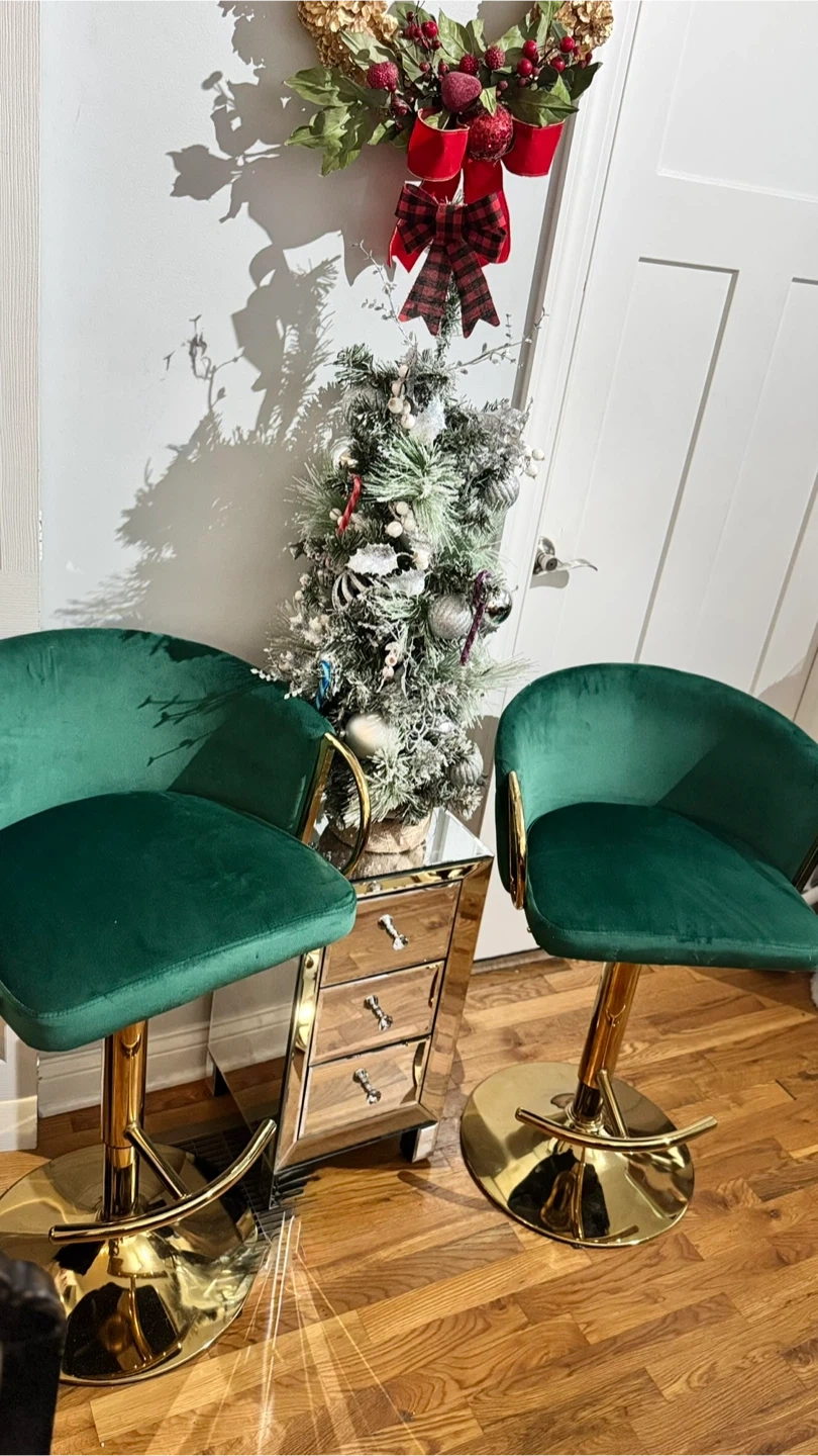 Selling a set of two stylish green velvet swivel bar stools. They would be a great addition to any kitchen or bar area! The stools feature a comfortable velvet seat and a sturdy gold base.