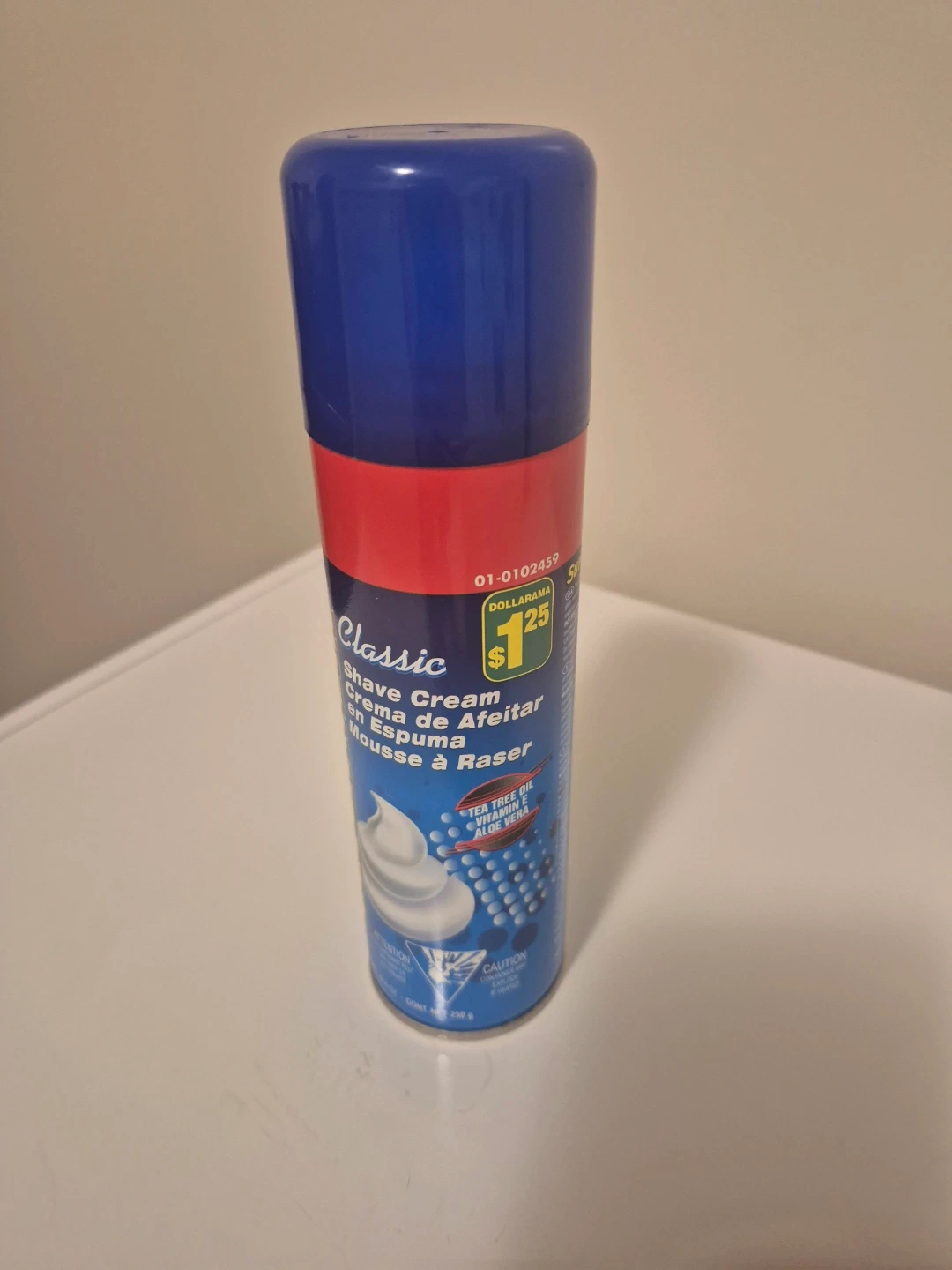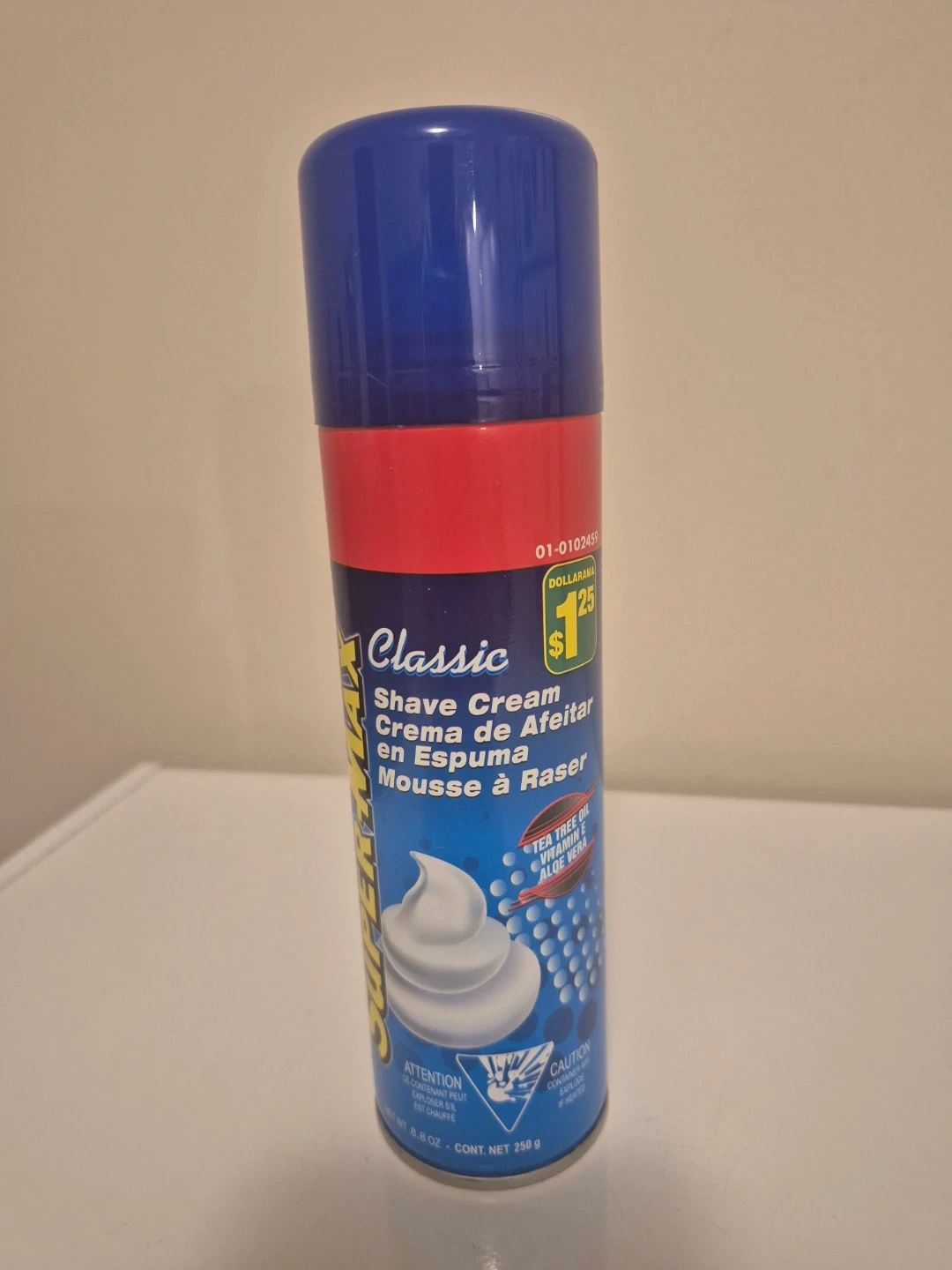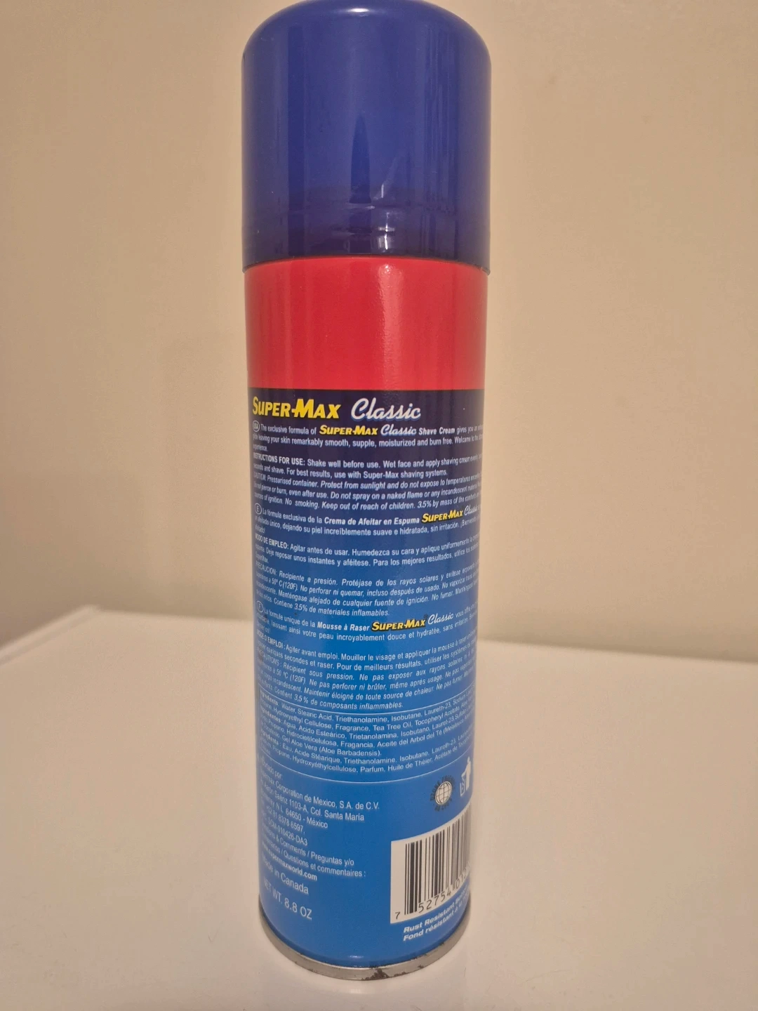 Selling a can of Super-Max Classic shave cream. It has tea tree oil and aloe vera. The can contains 8.8 oz / 250 g of product.