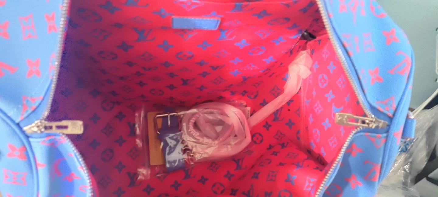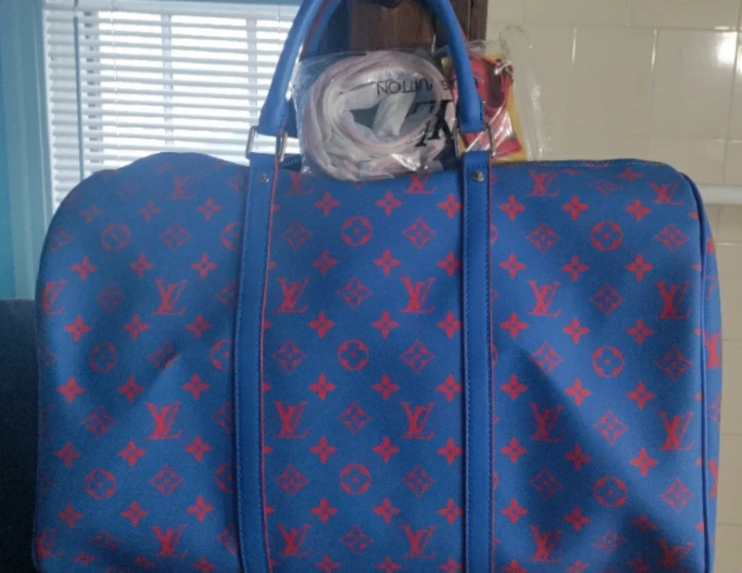 Here's a stylish Louis Vuitton duffle bag featuring a vibrant blue background with a red monogram pattern. It's a great statement piece for travel or everyday use. Comes with the original dust bag!