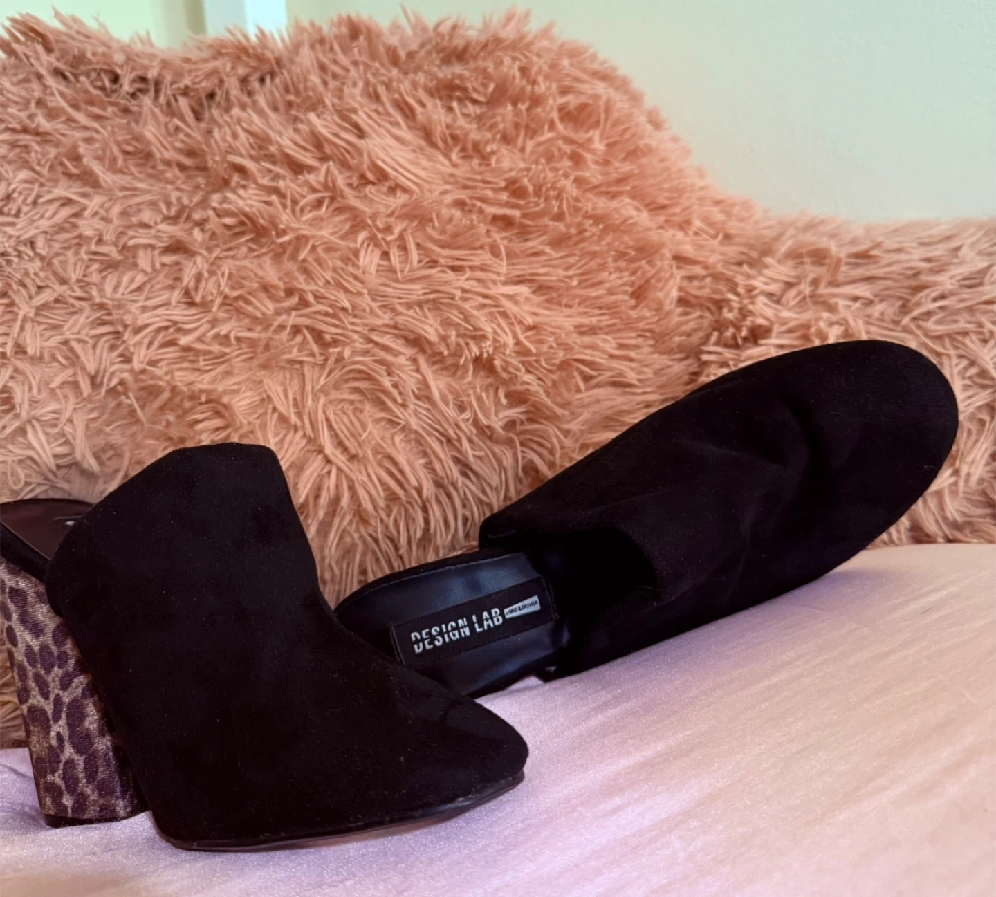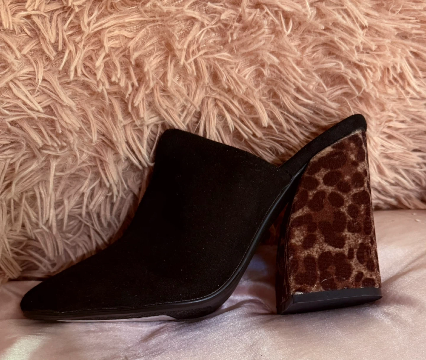 Design Lab black suede mules! They have a fun leopard print on the heel. They're in great condition and ready for a new owner!