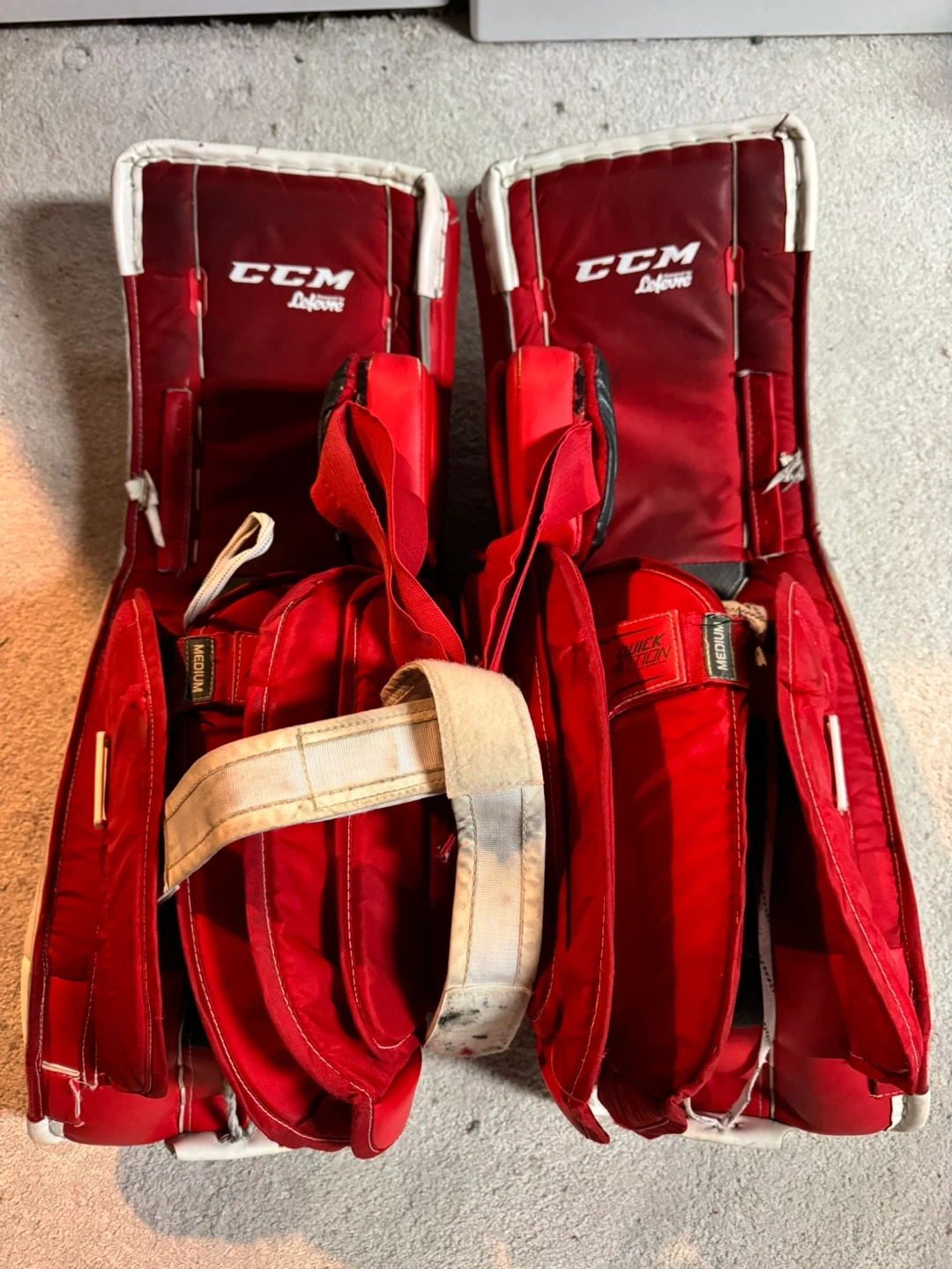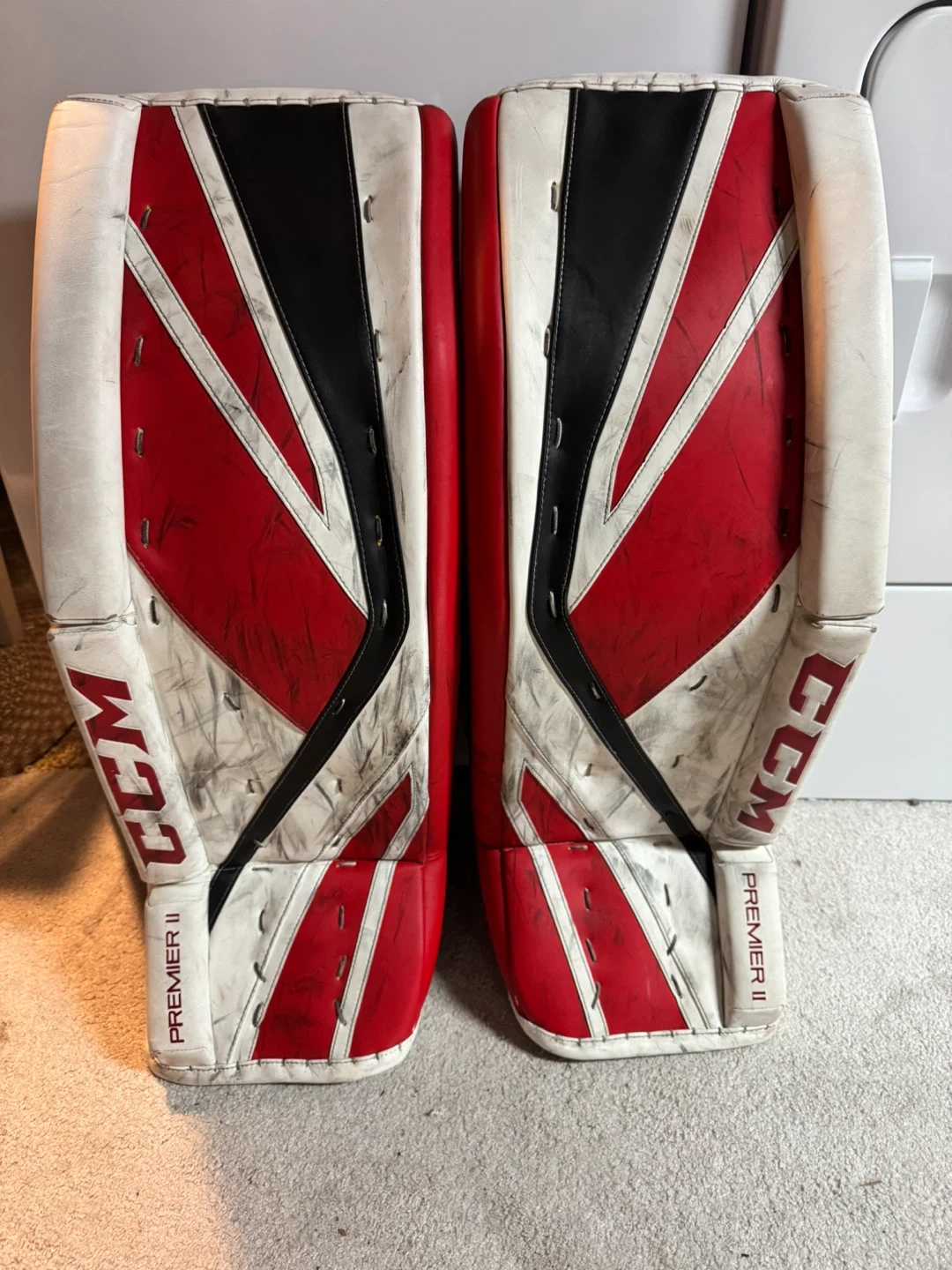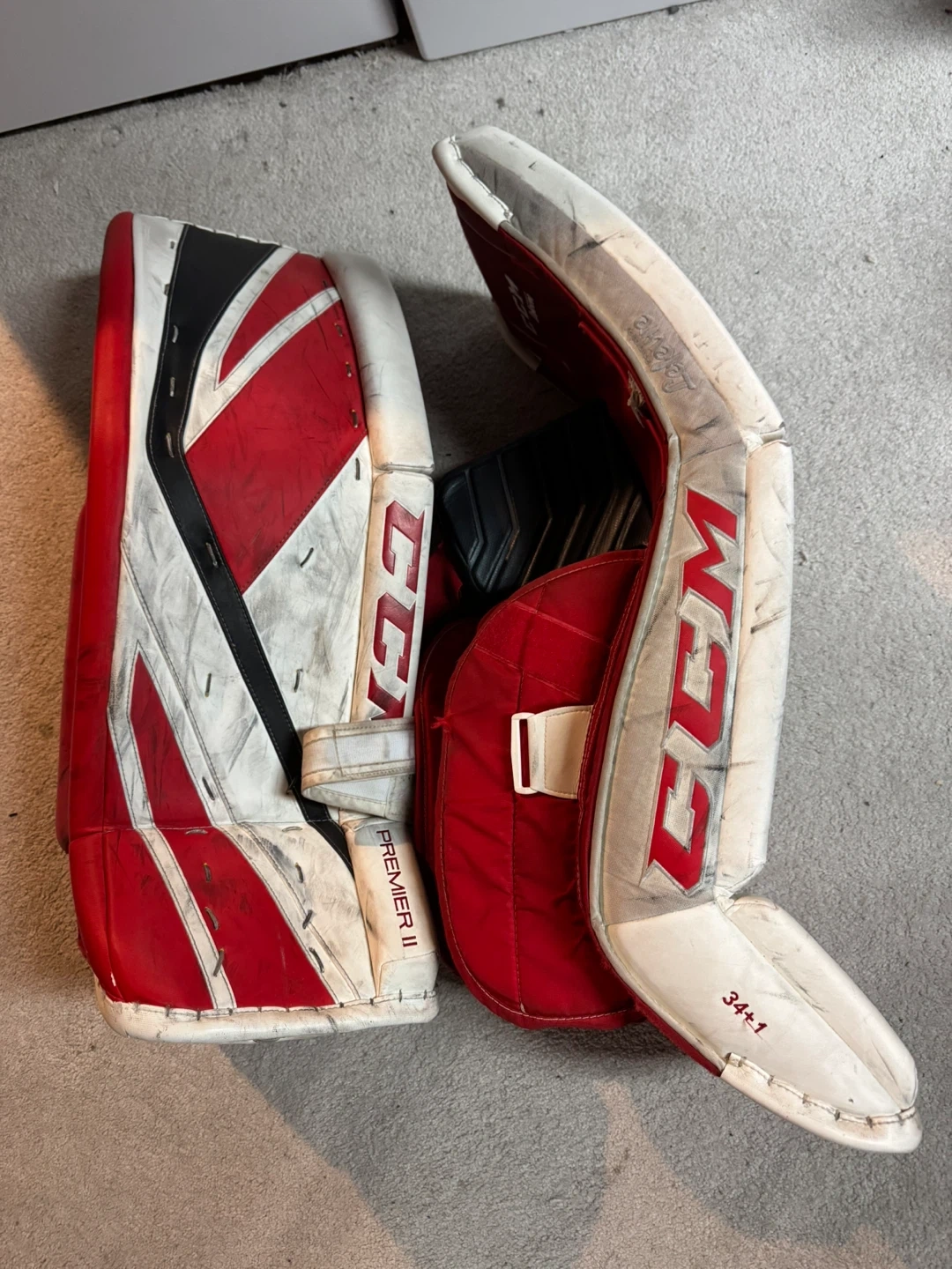 These are a pair of CCM Premier II goalie pads in size 34+1. They have been used, but are in good condition with some wear and tear from normal use. They offer great protection and flexibility.