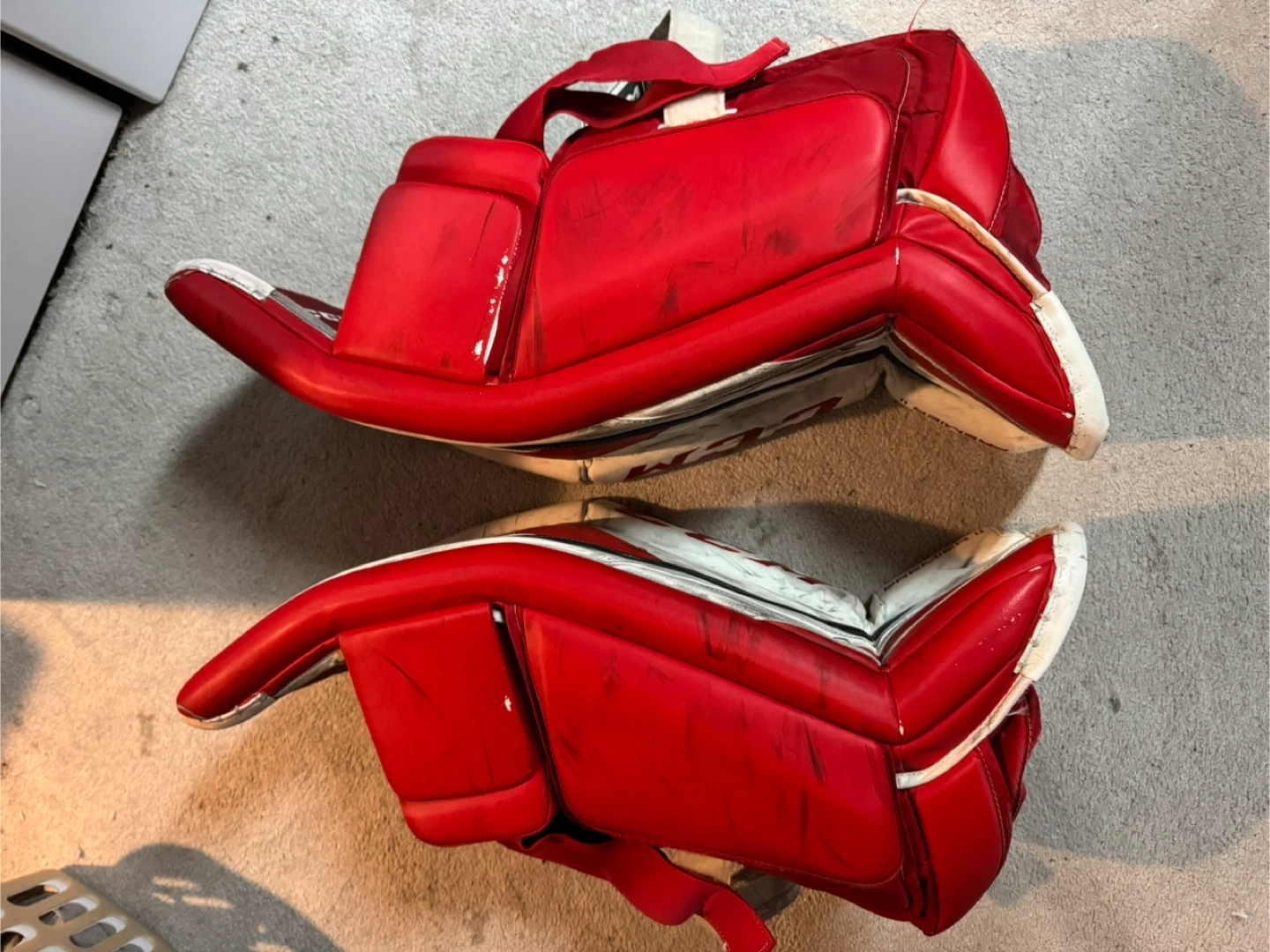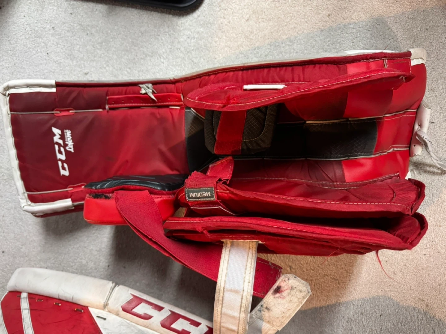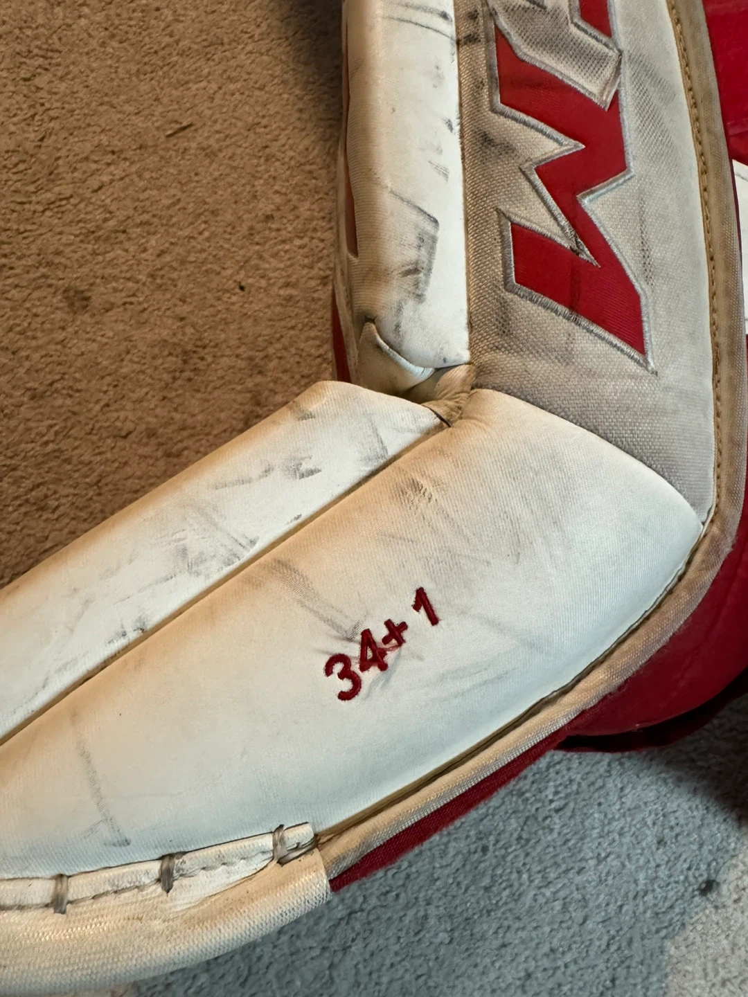 These are a pair of CCM Premier II goalie pads in size 34+1. They have been used, but are in good condition with some wear and tear from normal use. They offer great protection and flexibility.