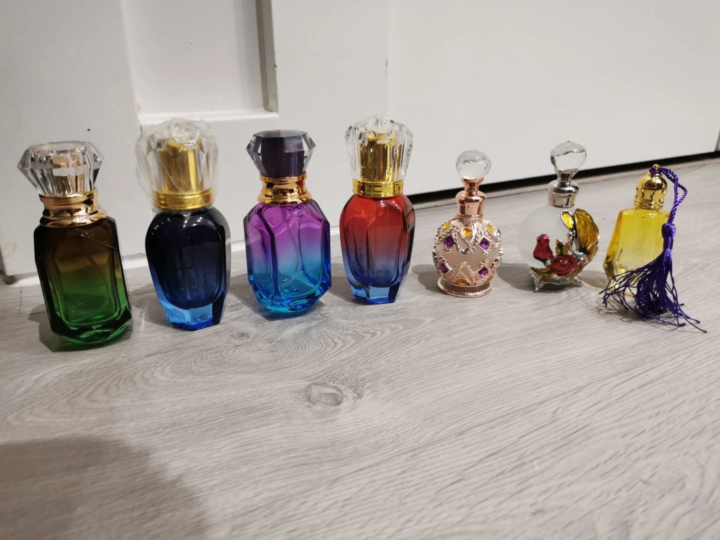 Selling a set of empty decorative perfume bottles. These are in great condition and would look lovely on a vanity or shelf. They come in a variety of colours and designs, including gradient glass, jeweled accents, and floral patterns!