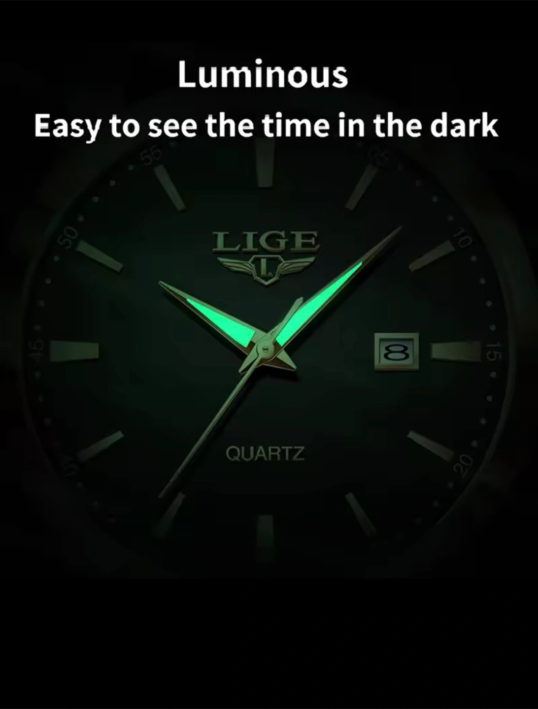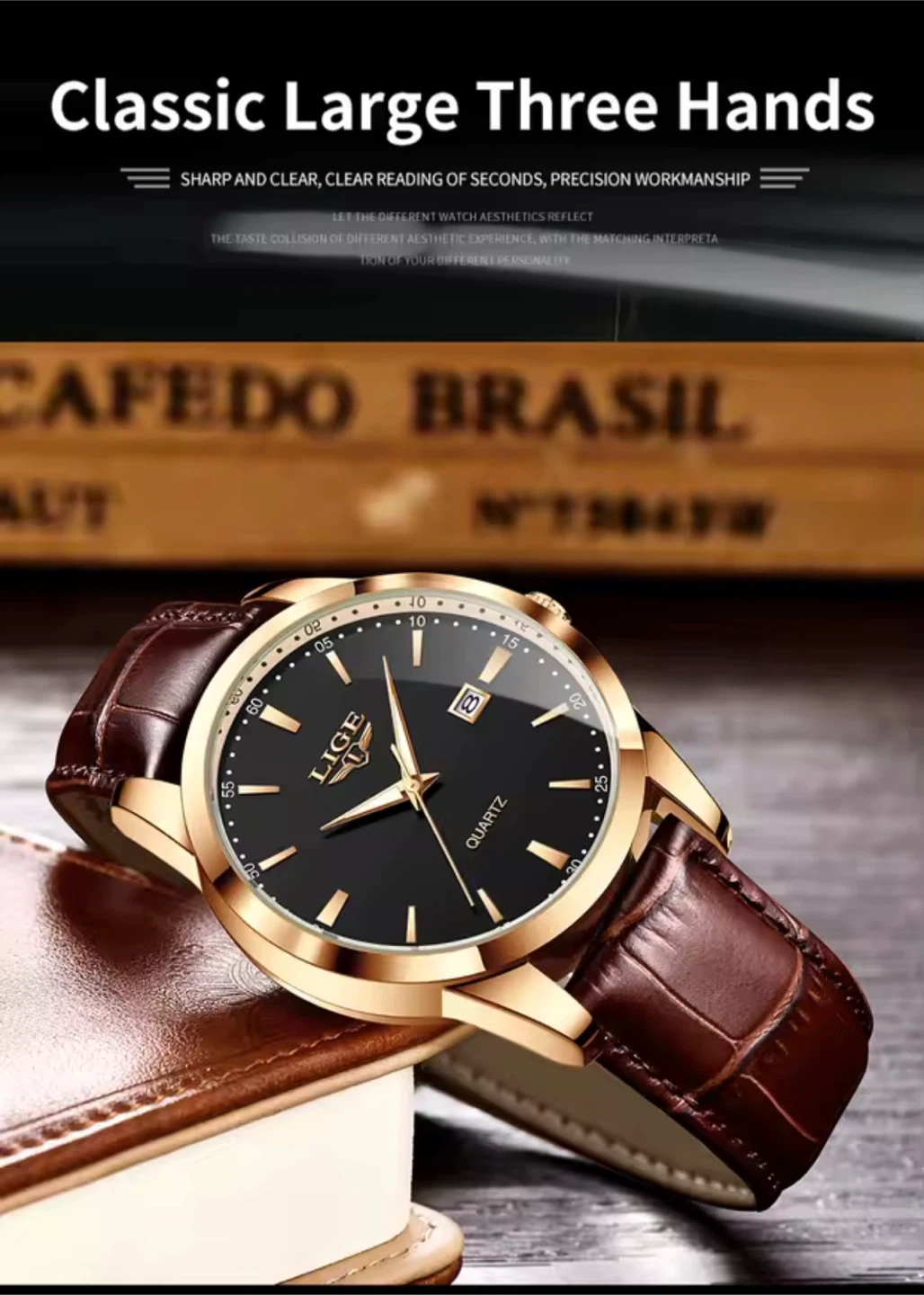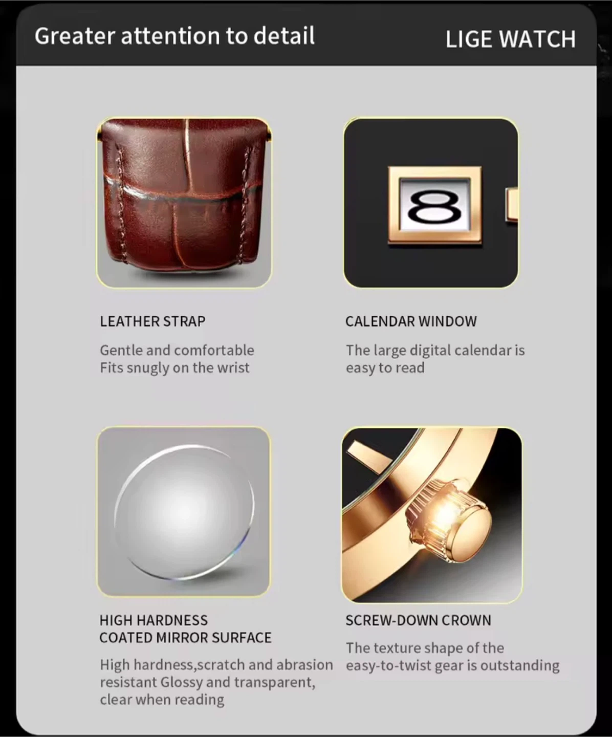 This LIGE watch features a leather strap that's gentle and comfortable, fitting snugly on the wrist. The large digital calendar is easy to read, and the high hardness coated mirror surface is scratch and abrasion resistant. It also has a screw-down crown and luminous hands for easy time reading in the dark