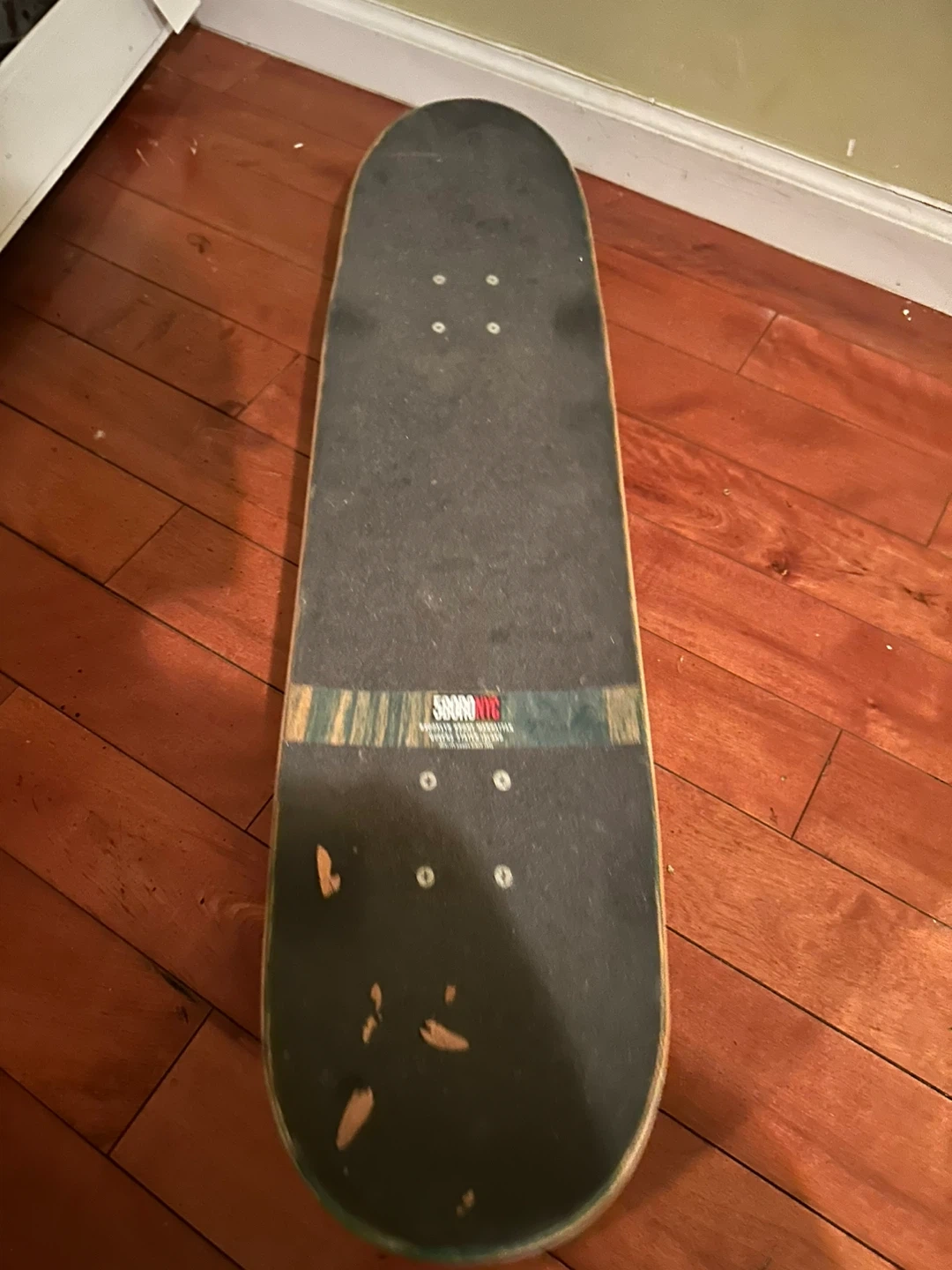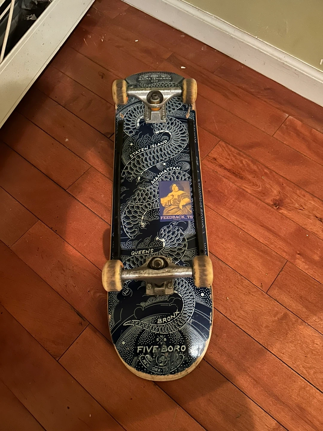 Selling a 5BORO NYC skateboard. It's in used condition, as you can see from the photos. Perfect for anyone looking to cruise around town. I attached some rails to it as well, feel free to ask any questions.