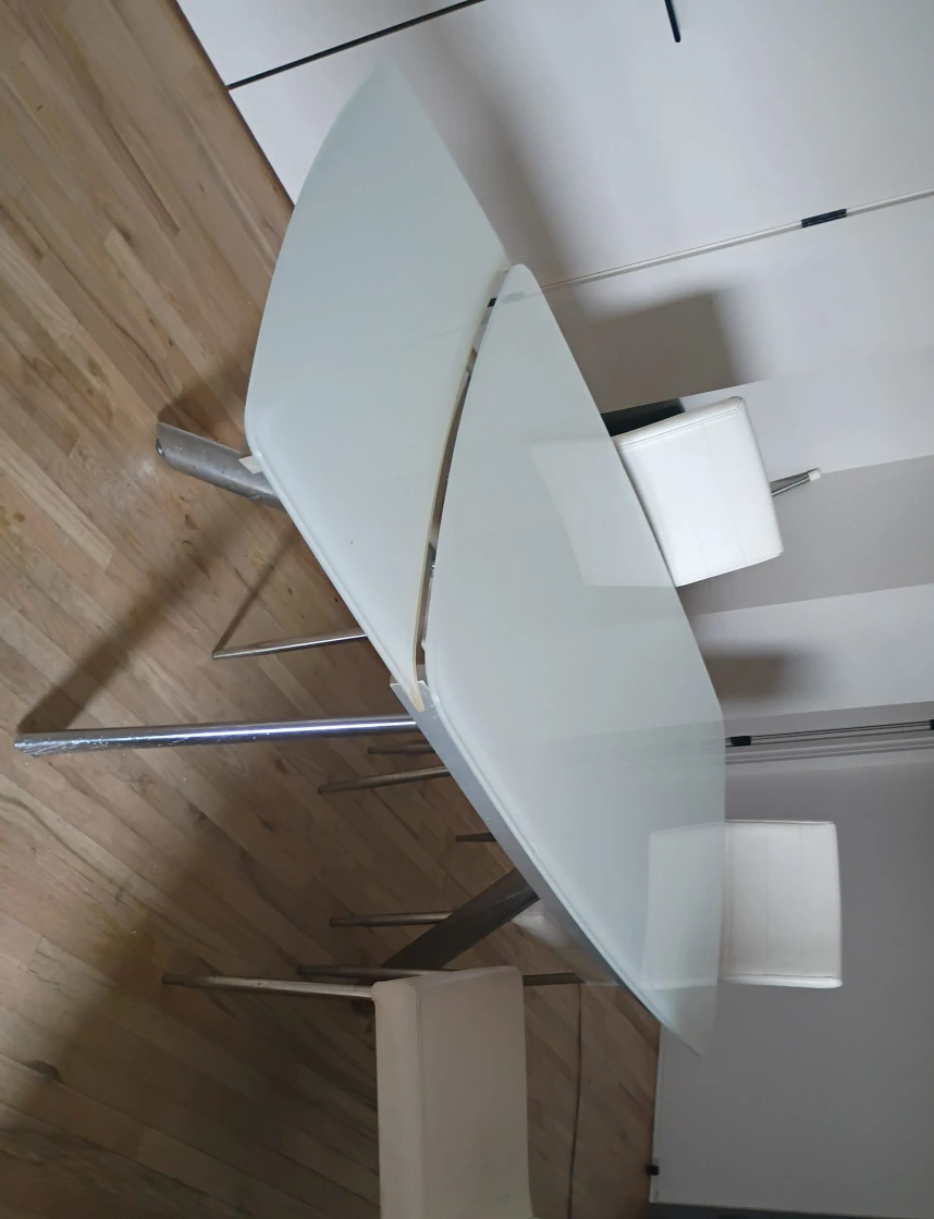 Selling a modern dining table set with a sleek white design. The table features a unique shape and the chairs are upholstered in white. Perfect for a contemporary dining space!