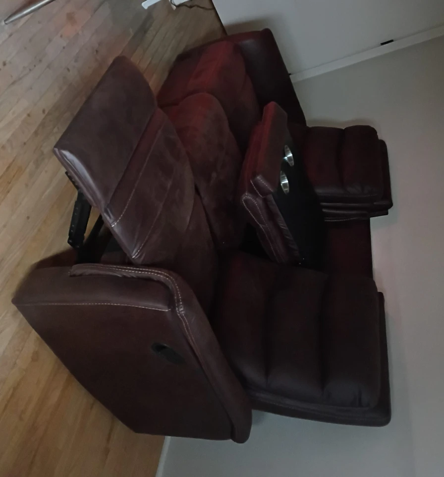 Selling a comfortable brown reclining sofa. It features built-in cupholders for your convenience. Perfect for relaxing and enjoying your favorite shows or movies!