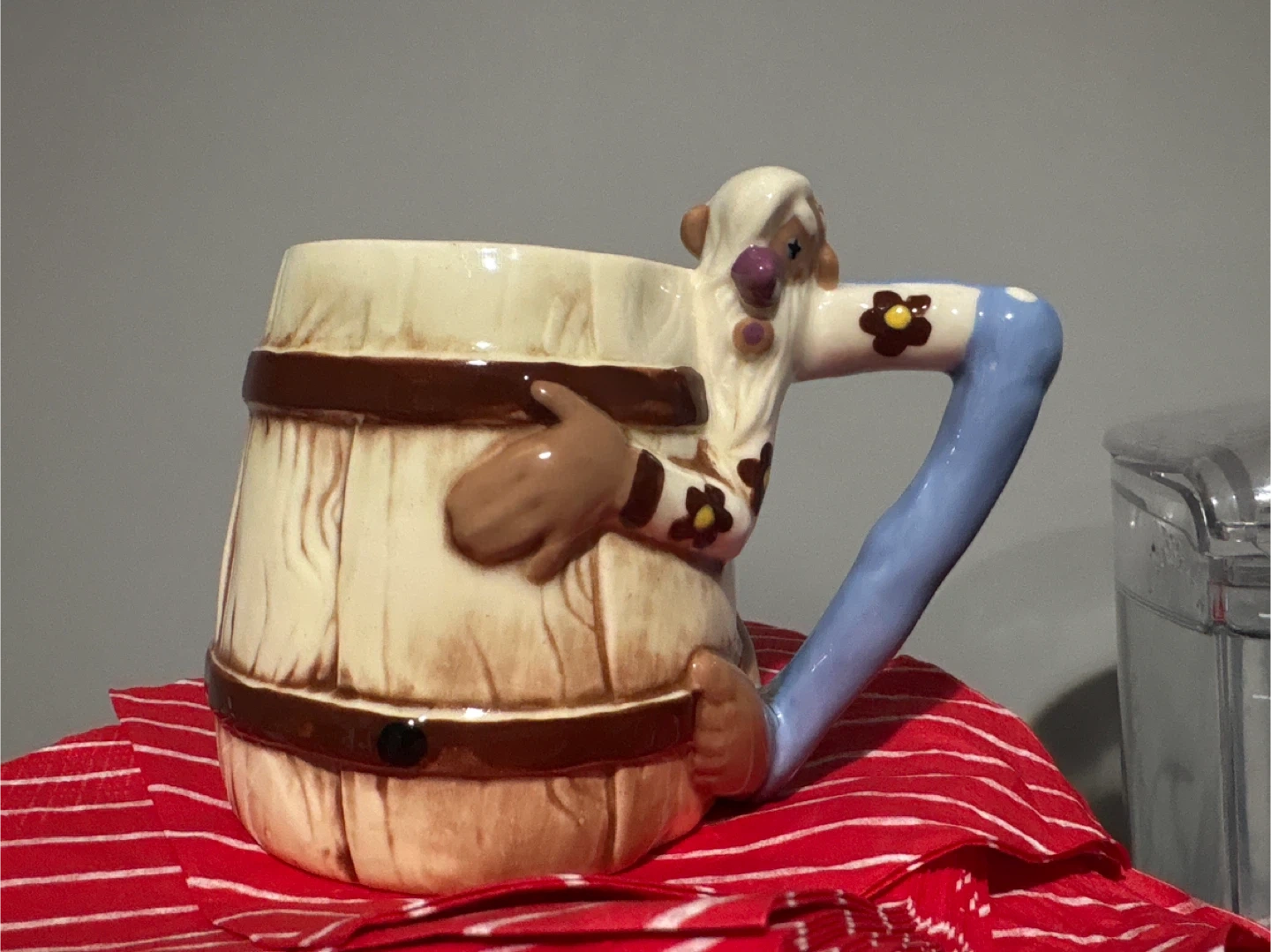 This is a very unique vintage mug shaped like a barrel with a man figure as the handle. It would be a great addition to any mug collection!