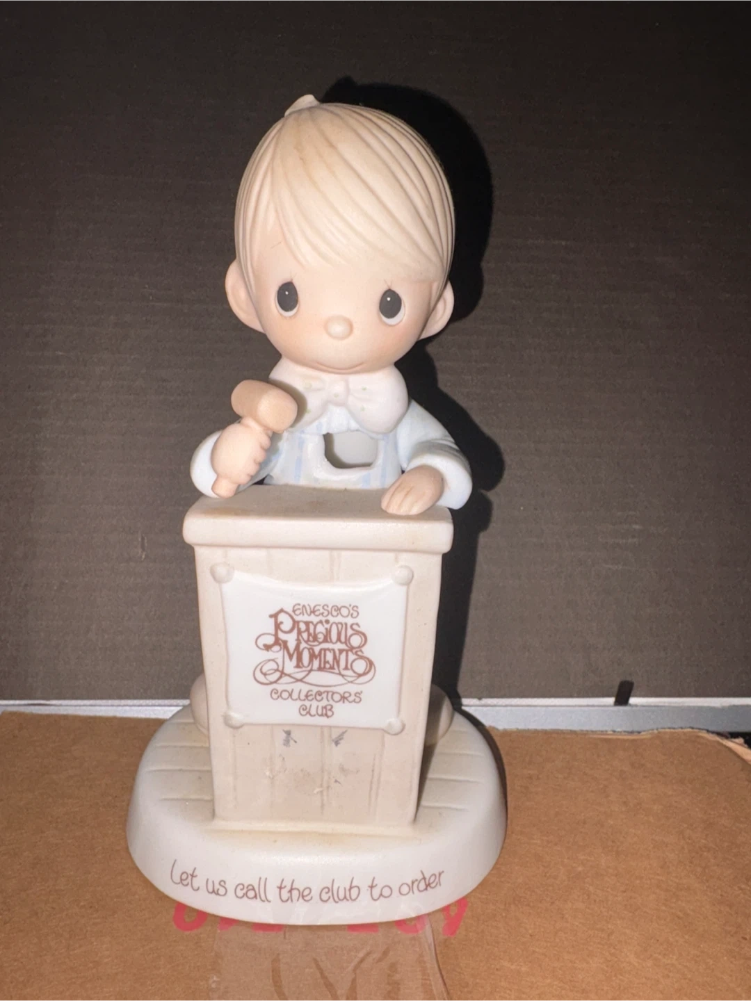 Selling a Precious Moments figurine from the Collector's Club by Enesco. The figurine features a boy at a podium with the text "Let us call the club to order" on the base. It's a cute piece for any collector!