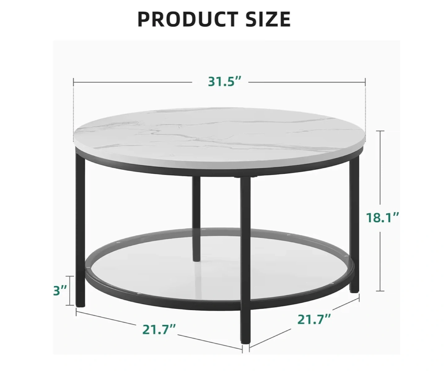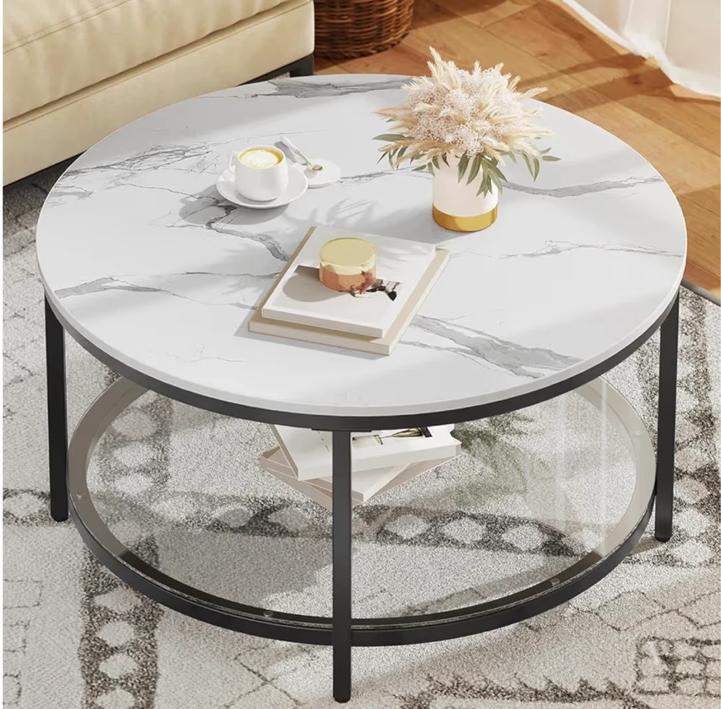 Selling a round coffee table with a faux marble top and a black metal frame. It features a lower shelf for storage or display.
