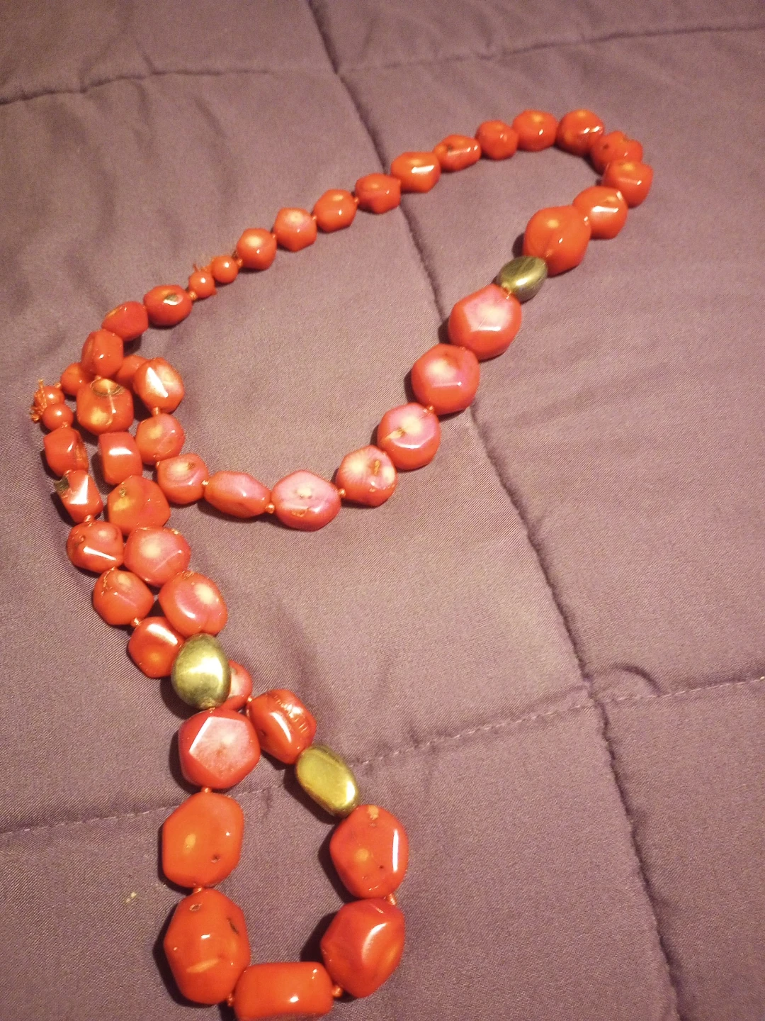 This is a beautiful red beaded necklace. It features various sizes of red beads, some with a shiny finish. It would be a great addition to any jewelry collection!