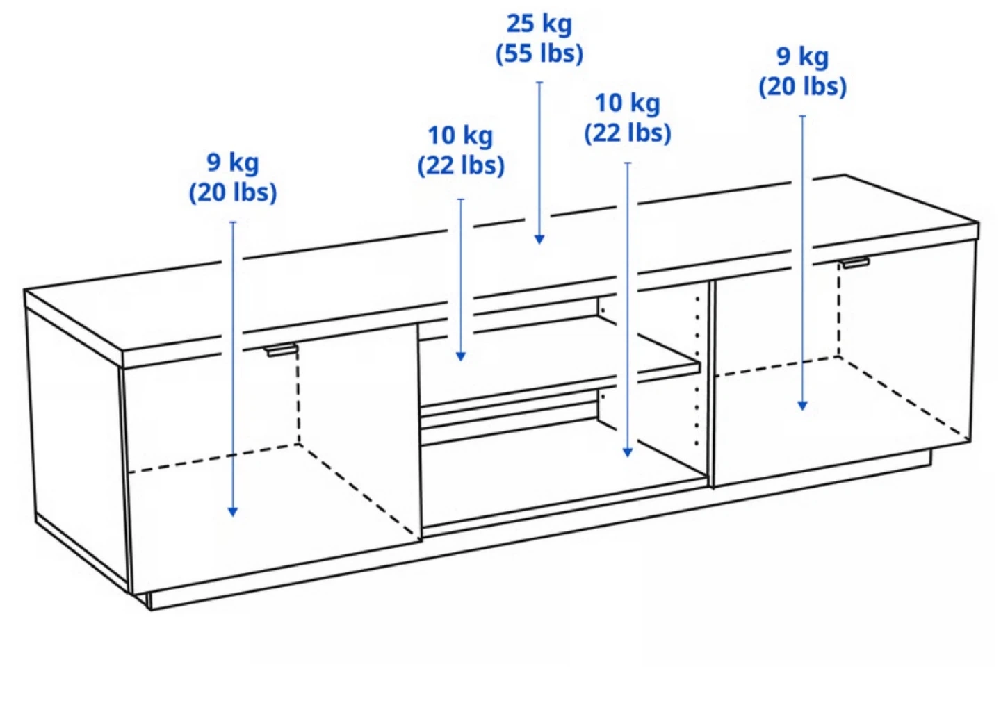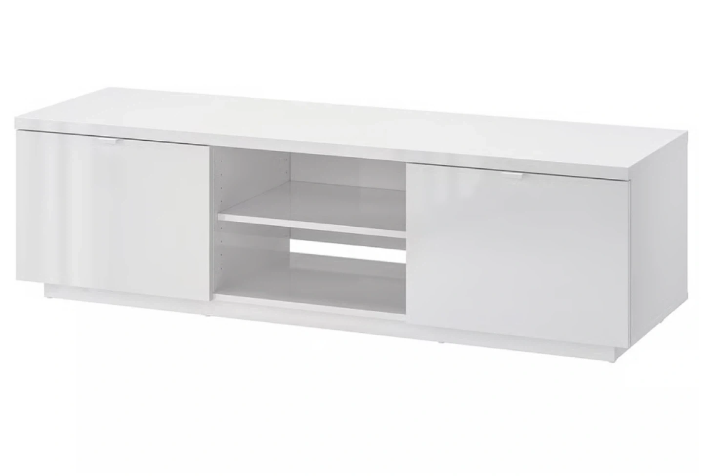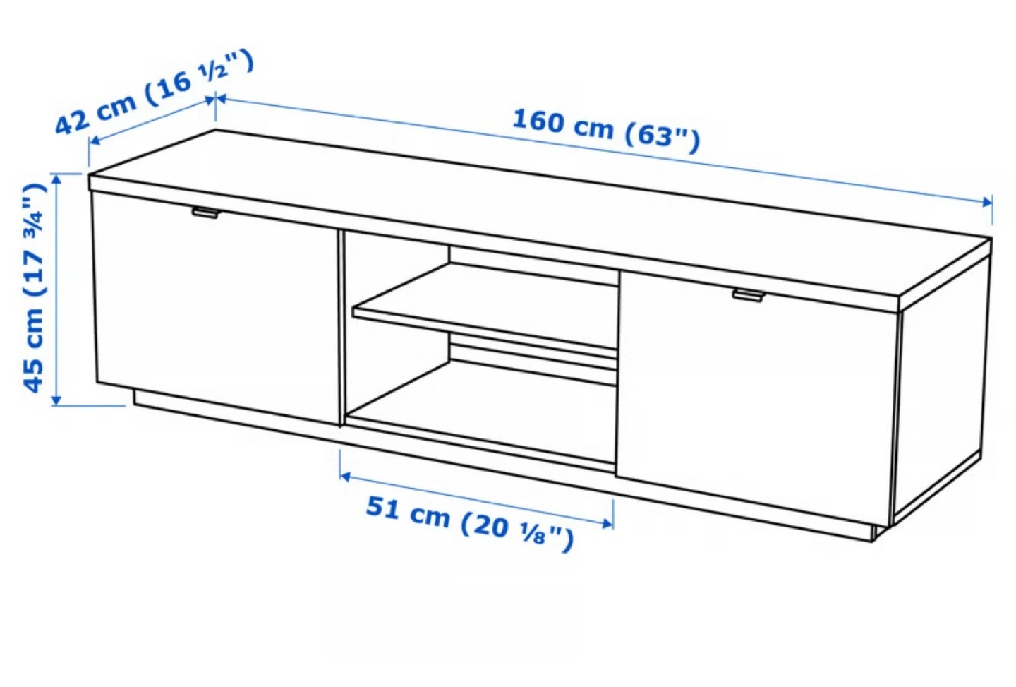 Selling a white IKEA BESTA TV unit!. Used: 7.5/10 The dimensions are: - Width: 63 inches - Depth: 16 1/2 inches - Height: 17 3/4 inches It features two cabinets with doors and open shelving in the middle. Perfect for storing your media devices and accessories