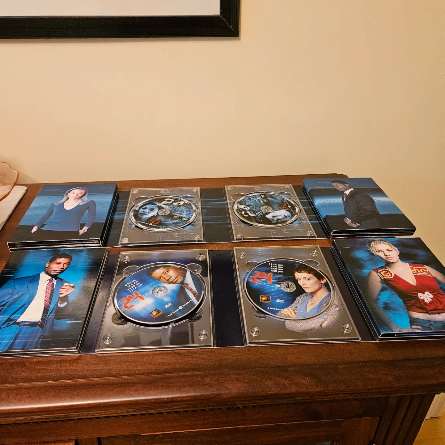 Selling the DVD collection of the TV series 24 seasons 1-4. Season 1 has 6 discs and seasons 2, 3 and 4 have 7 discs.