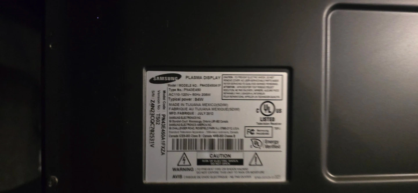 Selling a Samsung Plasma Display TV, model number PN43E450AiF. It's a reliable TV with a typical power of 84W. Manufactured in July 2012/.43"