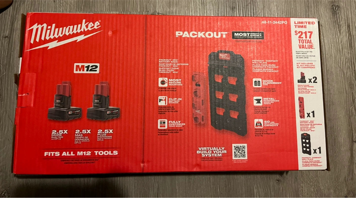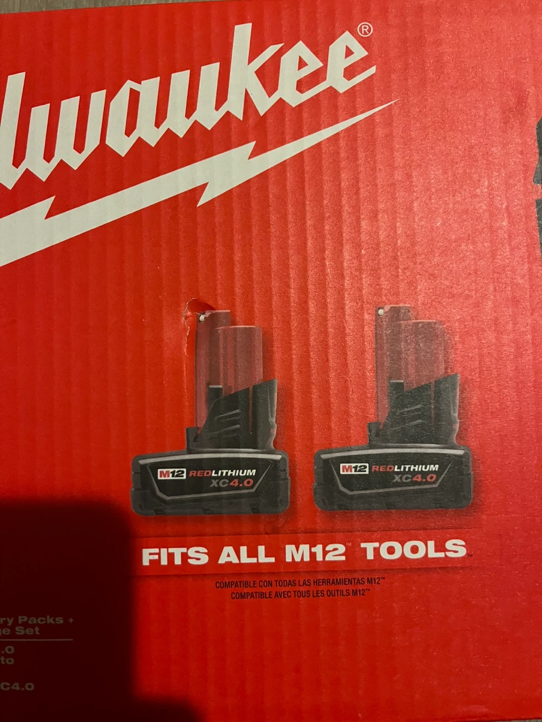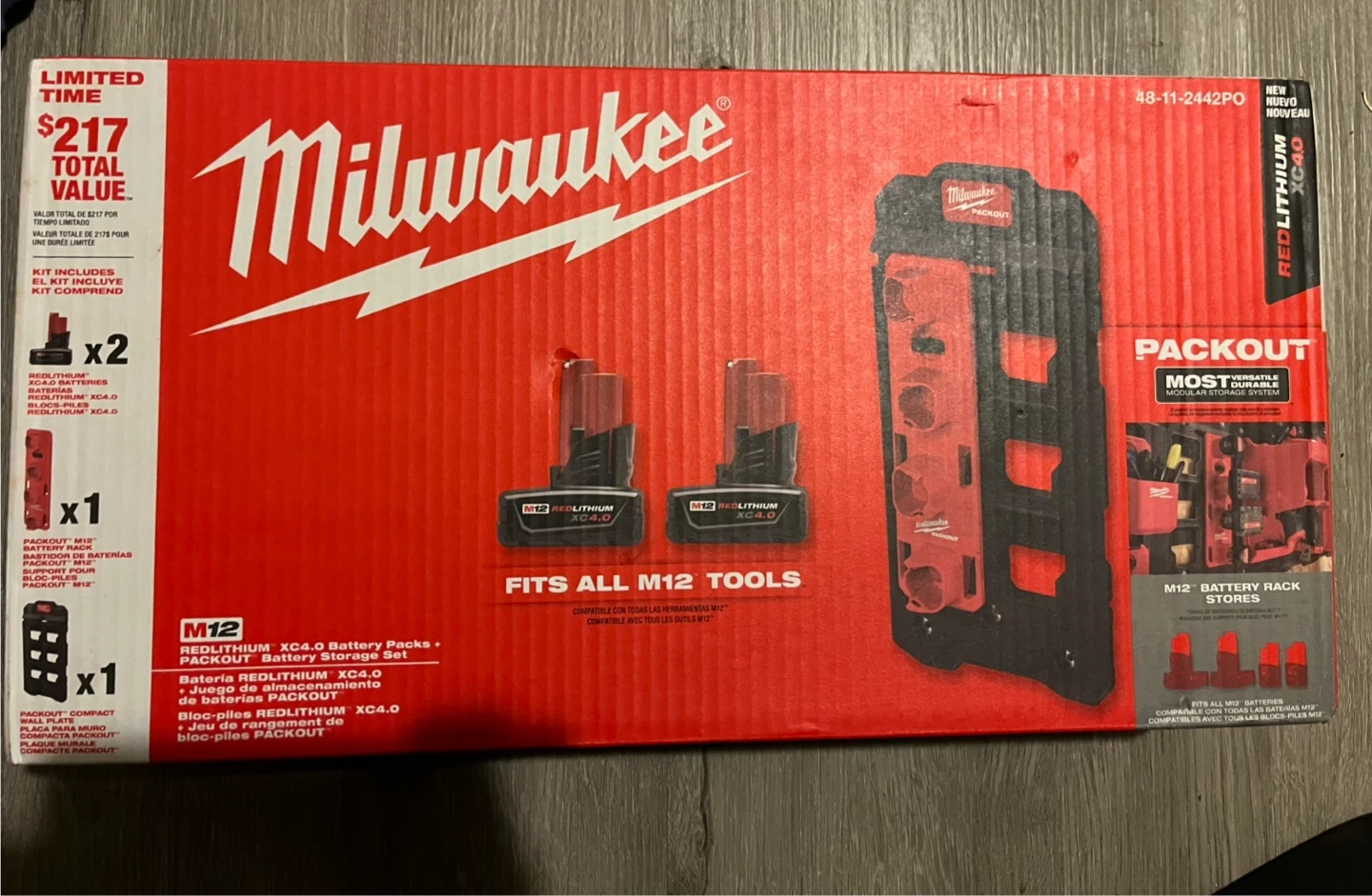Selling a Milwaukee M12 REDLITHIUM XC4.0 Battery Pack. It fits all M12 tools and includes two XC4.0 batteries, a battery rack, and a battery storage packout. The packout is compact and durable.