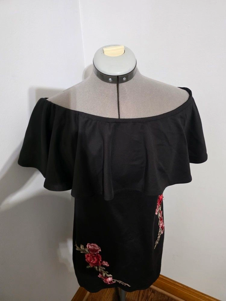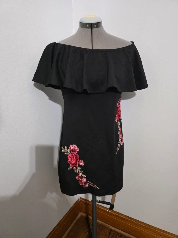 You'll look as pretty as a flower in this off the shoulder dress! With a flouncy off the shoulder style and beautiful floral embroidery, this dress is destined to turn heads! Pair with a stappy sandal to complete the look.