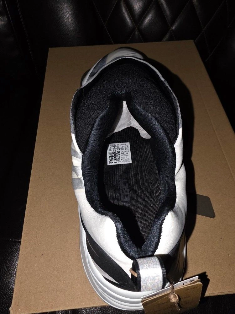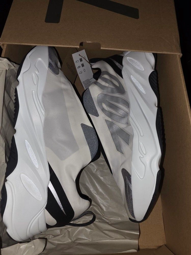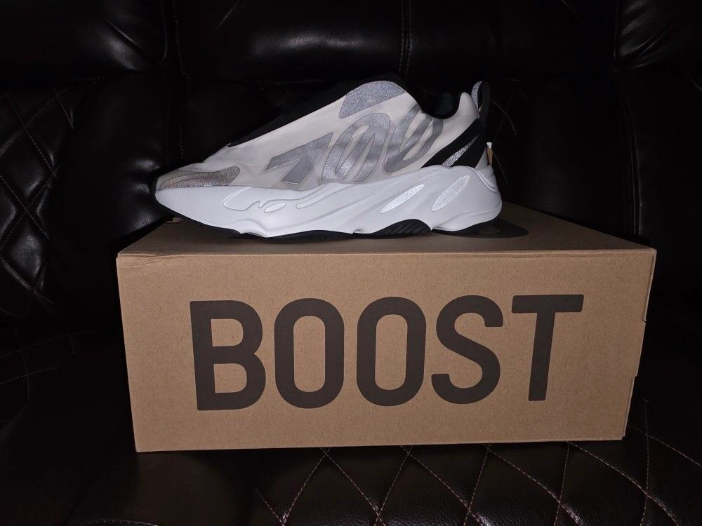 Bone nylon upper paired with reflective detailing. A solid, black sole with Boost cushioning completes the design. Released April 2020