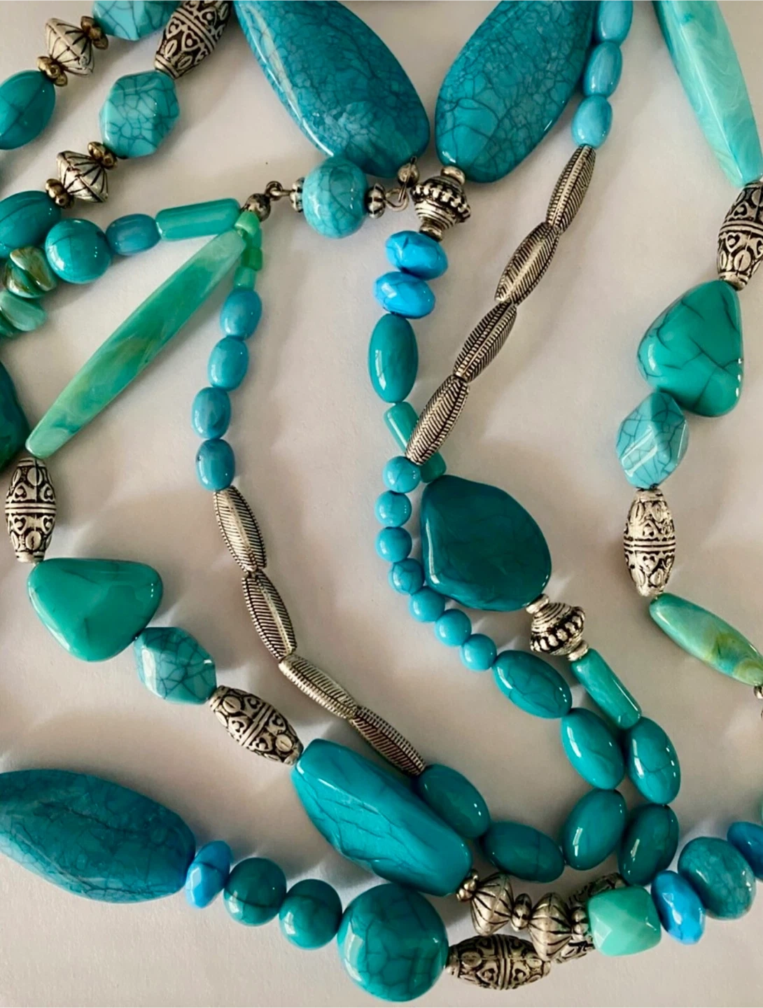 This is a lovely turquoise beaded necklace. The beads are various shapes and sizes, and the necklace is approximately 15 inches long.