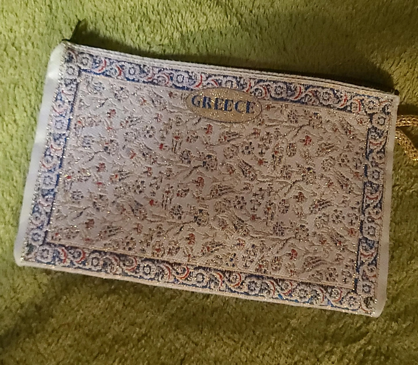 Souvenir pouch from Greece, perfect for carrying small items or as a unique accessory! It features a beautiful woven design with a gold-coloured zipper and chain.