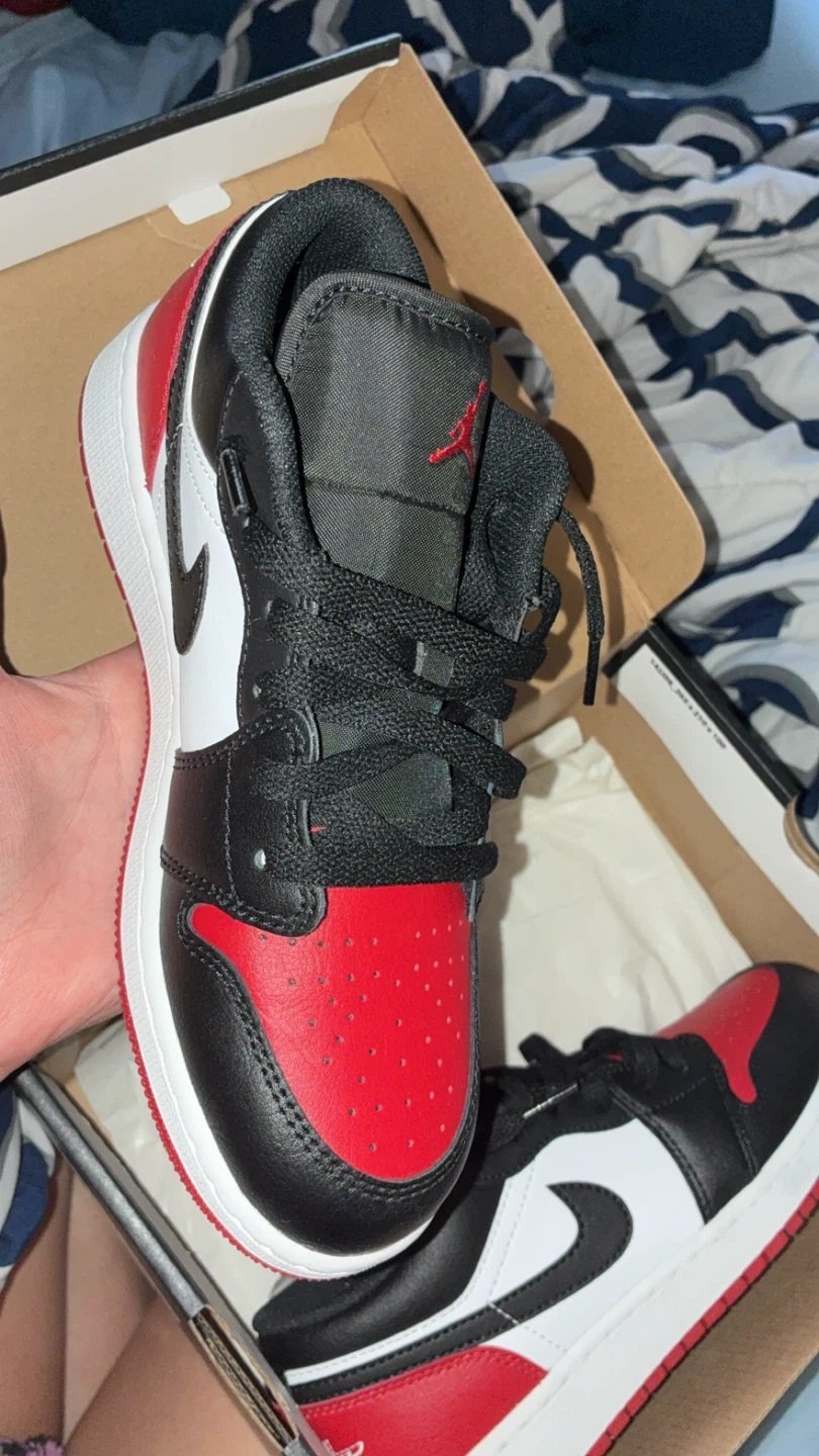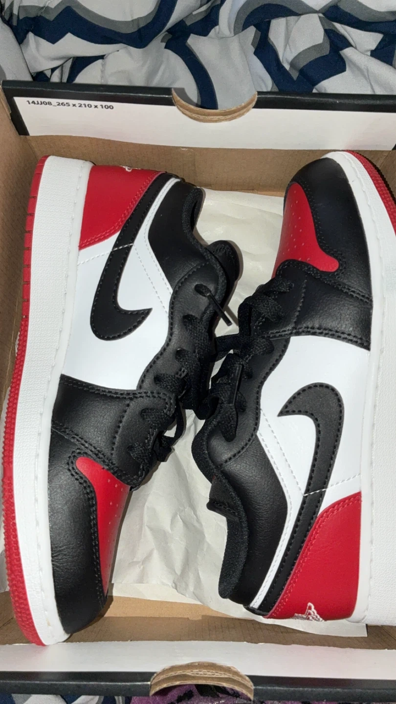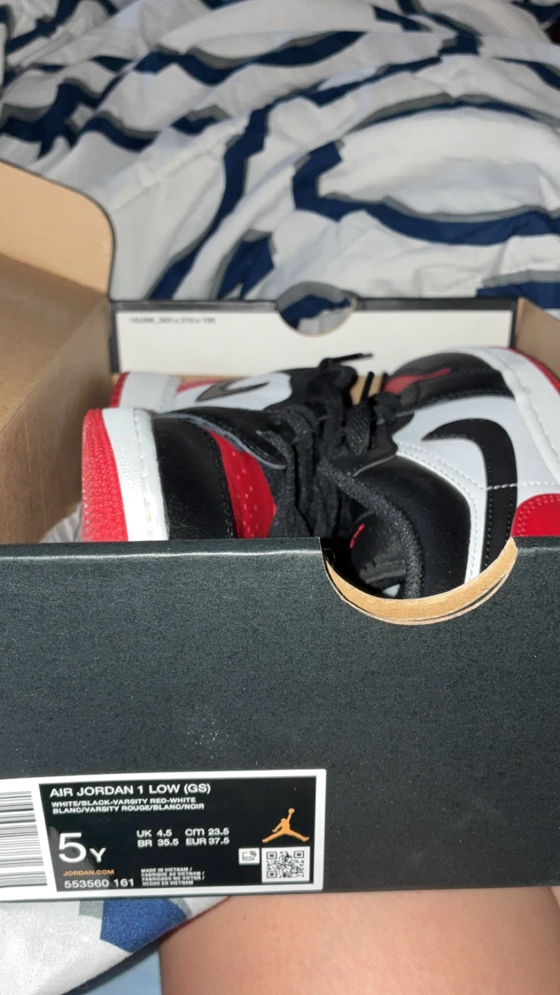Selling a pair of Air Jordan 1 Low (GS) in black, white, and varsity red. These are size 5Y and come with the original box. The box is included!