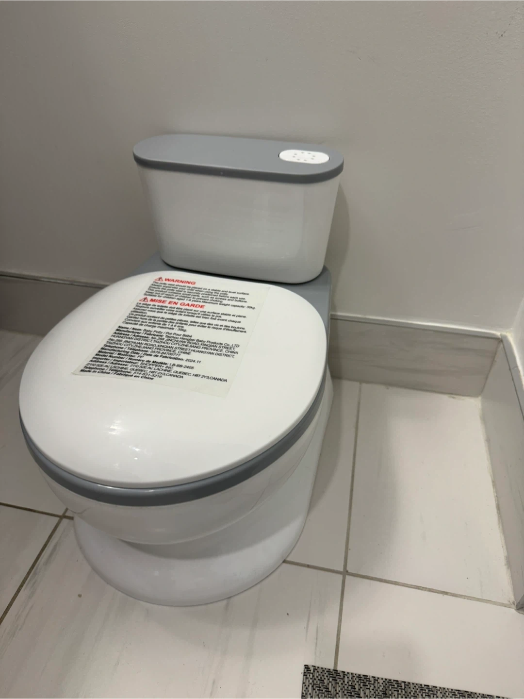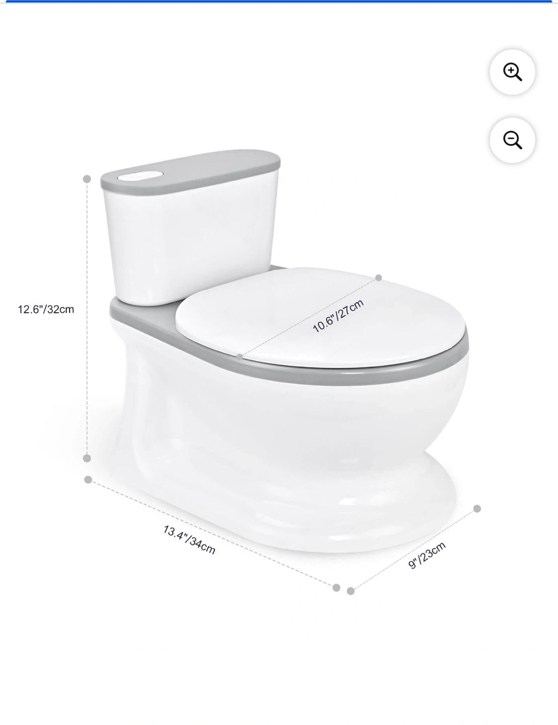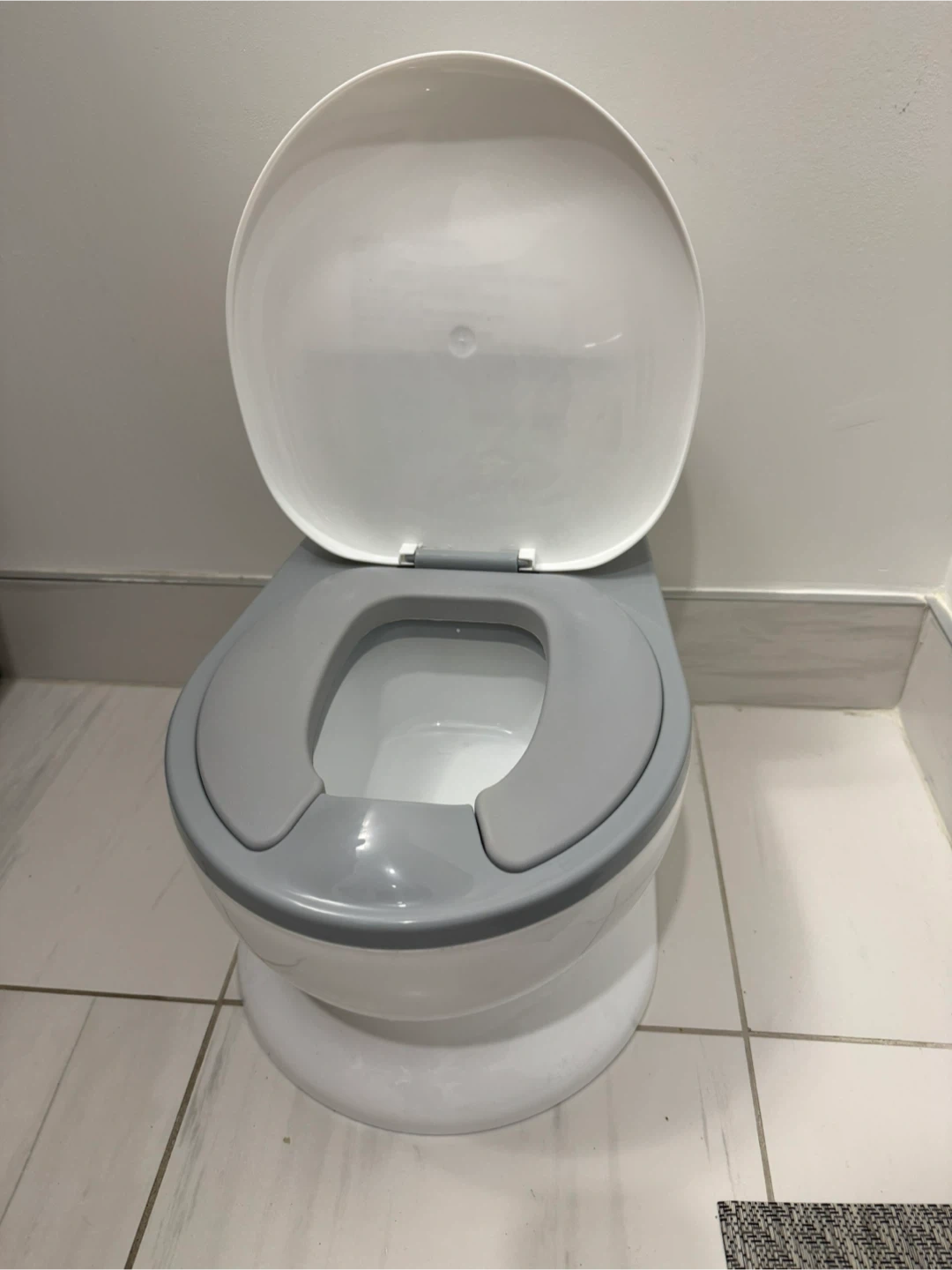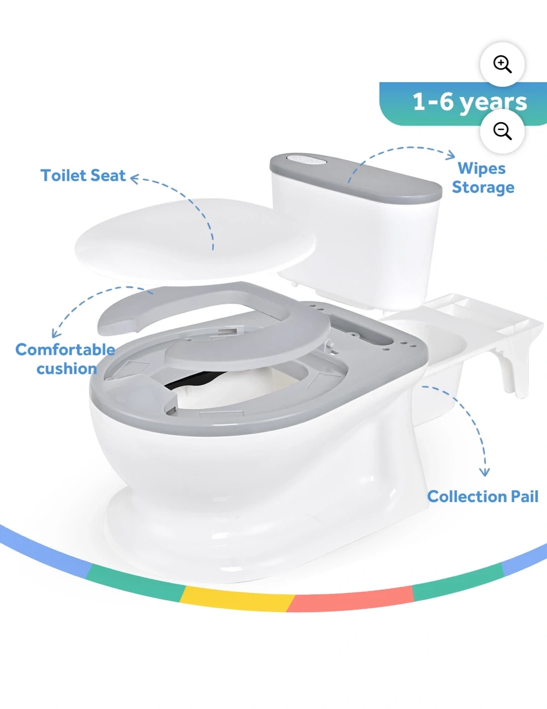 Brand new toddler training toilet is ready for its little user. It features a comfortable cushion seat, wipes storage, a collection pail and makes realistic flush sound.