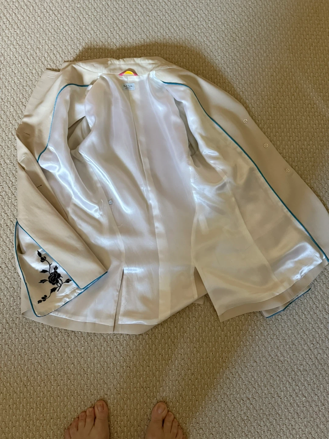 Selling a Paul Smith women's blazer in a lovely neutral colour! It's a size 42 and made in Italy. There are some small marks on the front, as shown in the photos. The lining has a beautiful floral pattern.