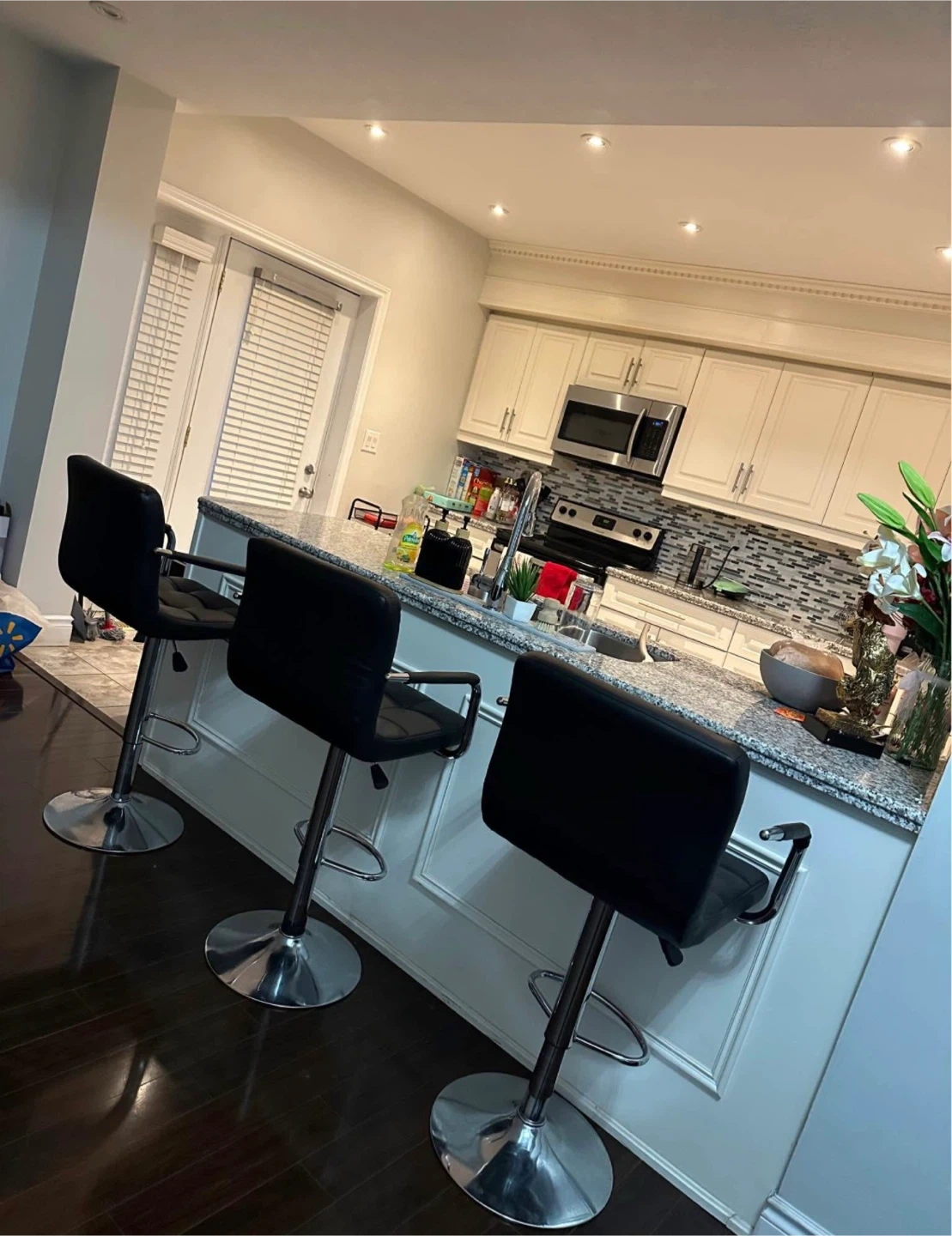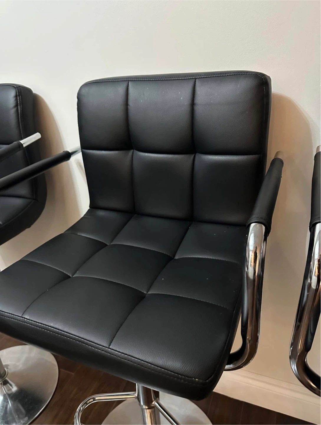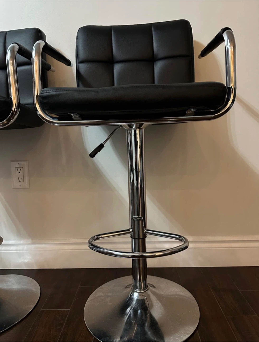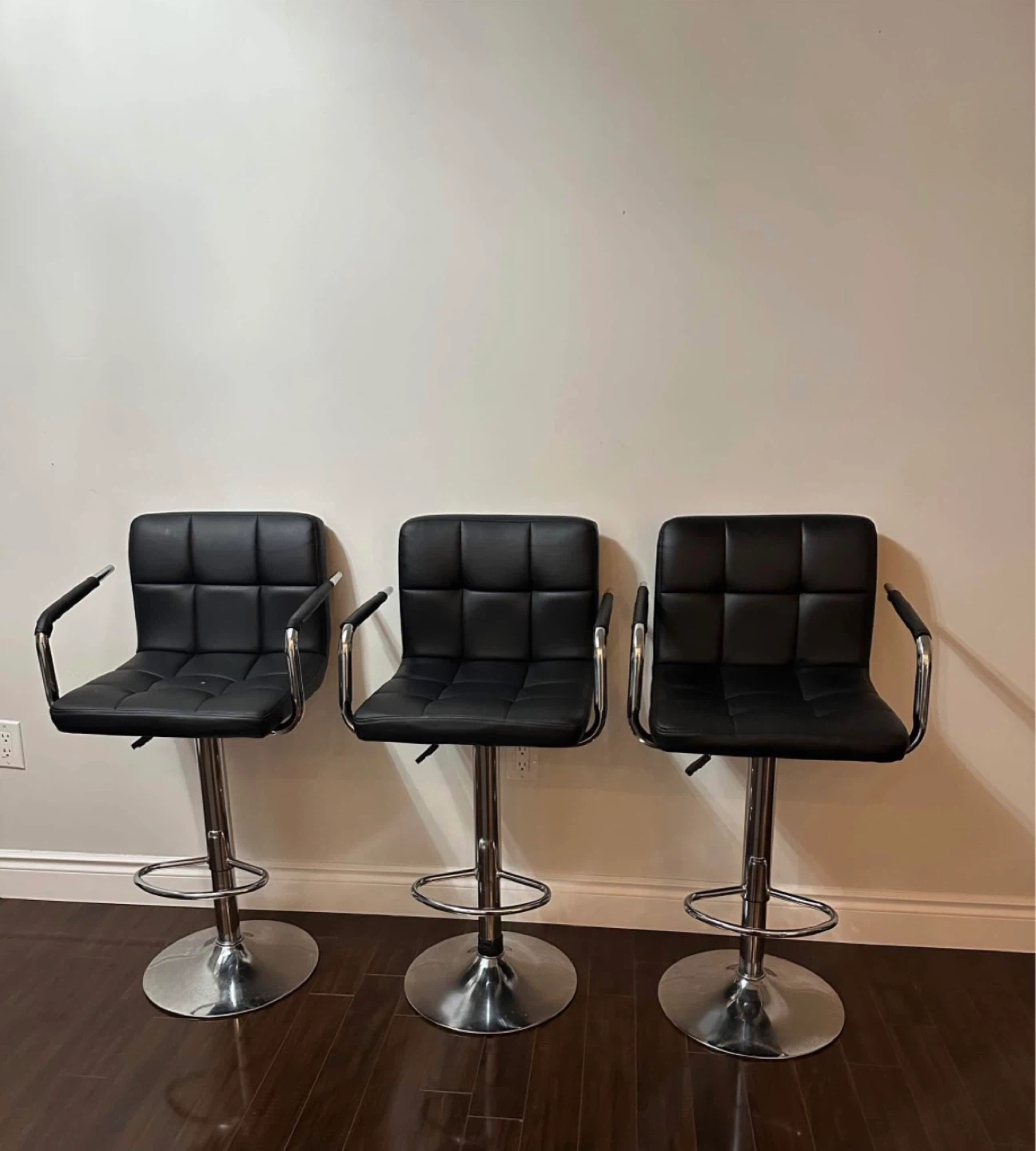 Selling a set of three stylish black bar stools! They feature a sleek design with a chrome base and comfortable, padded seats. Perfect for adding a modern touch to your kitchen or bar area