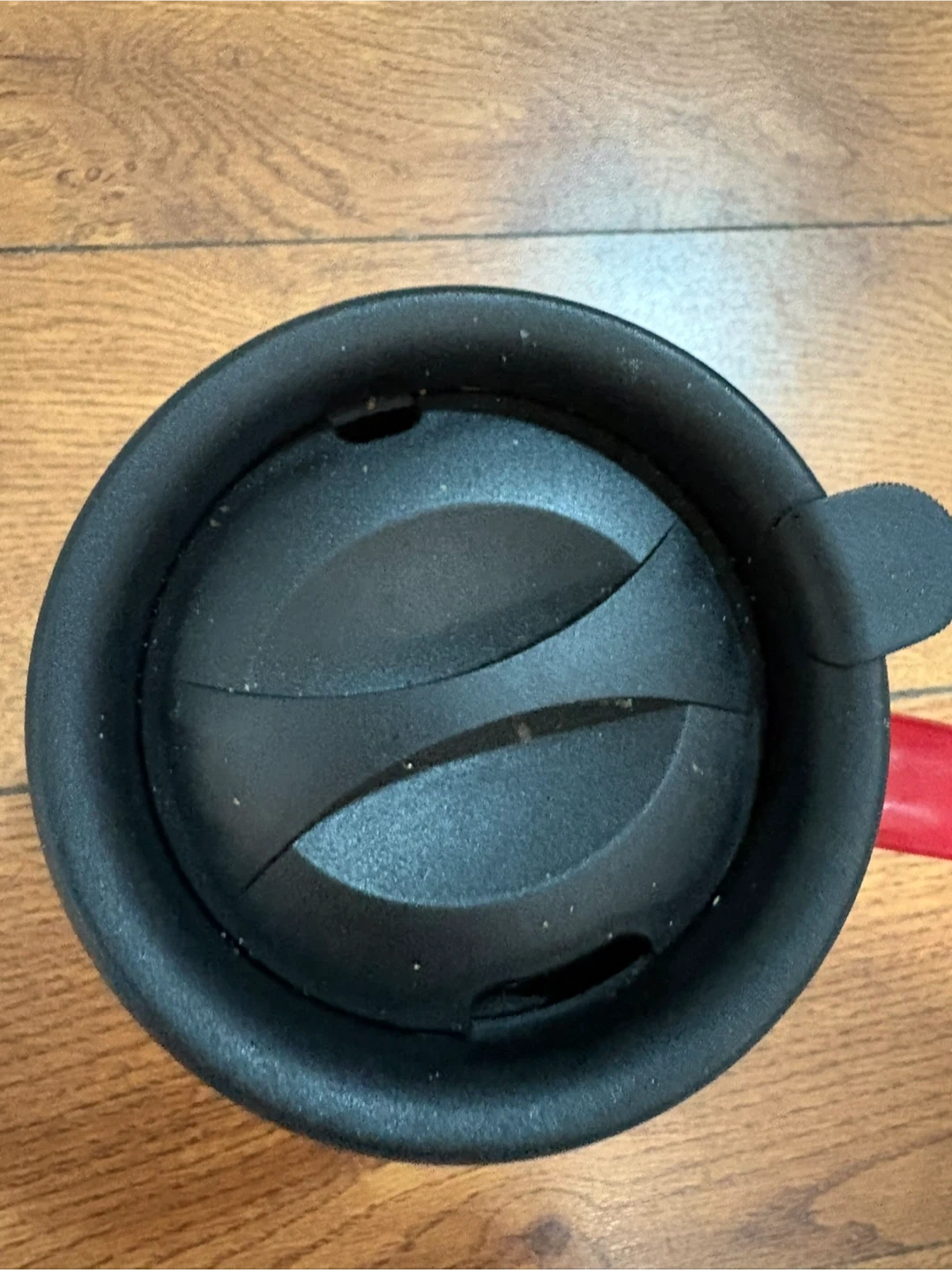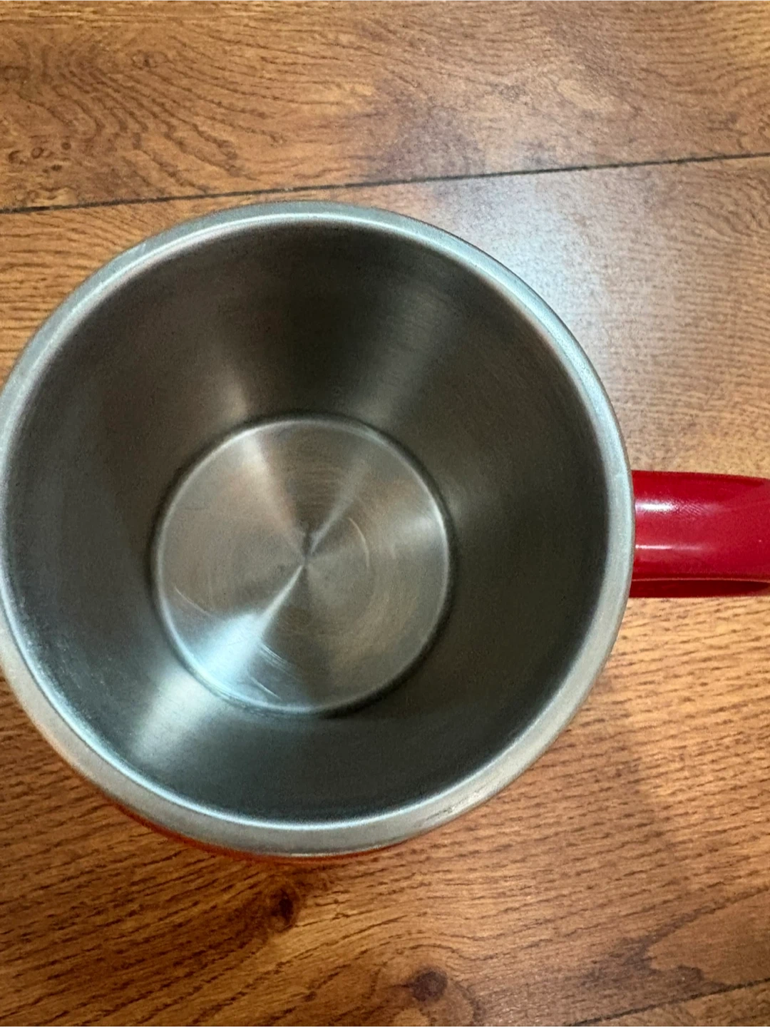 I'm selling a red travel mug with a stainless steel interior and a black lid. It's in great condition and ready for your favourite hot or cold beverage