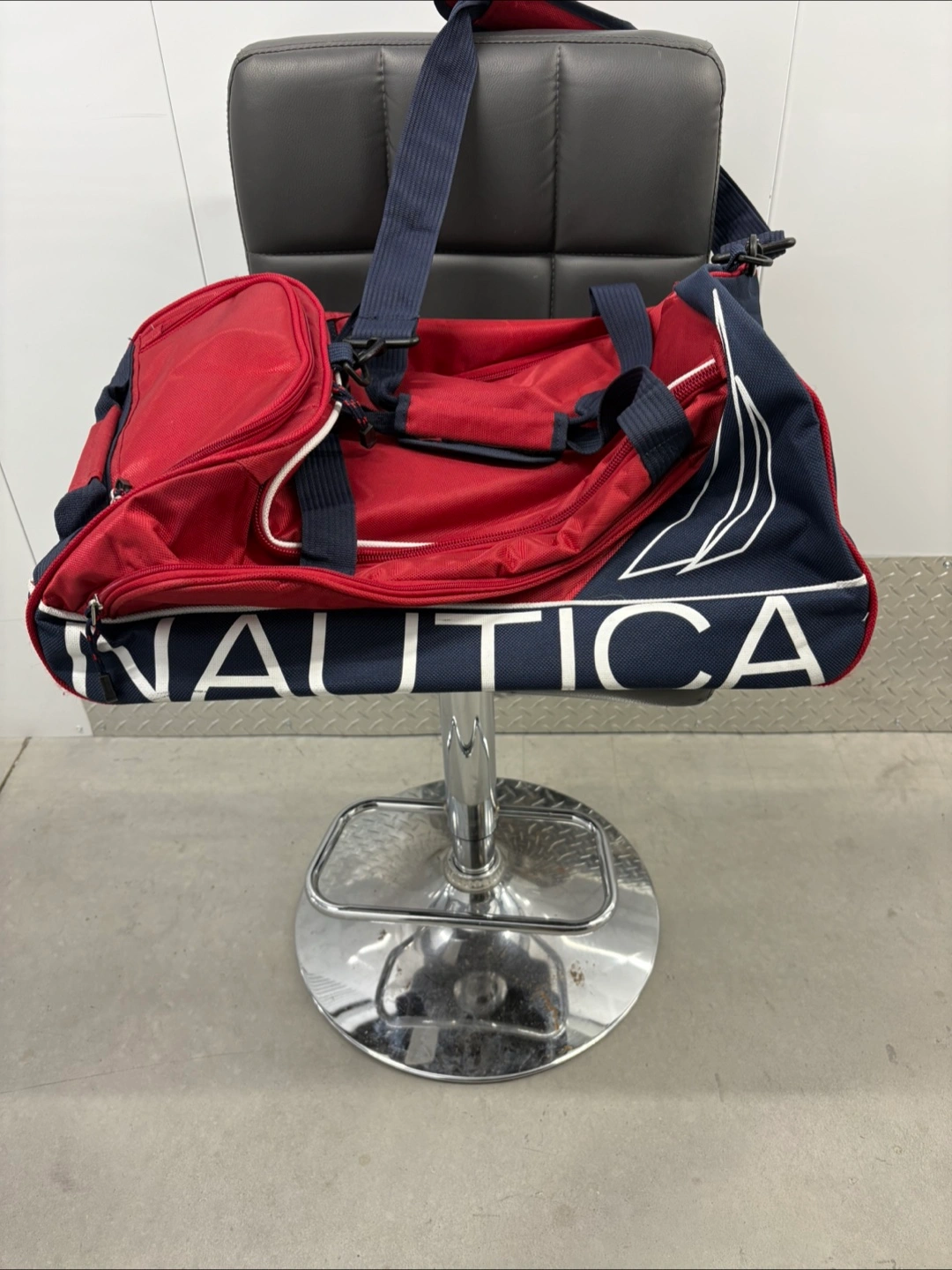 Here's a Nautica duffel bag in red and navy! It's in great shape and ready for your next trip to the gym or a weekend getaway