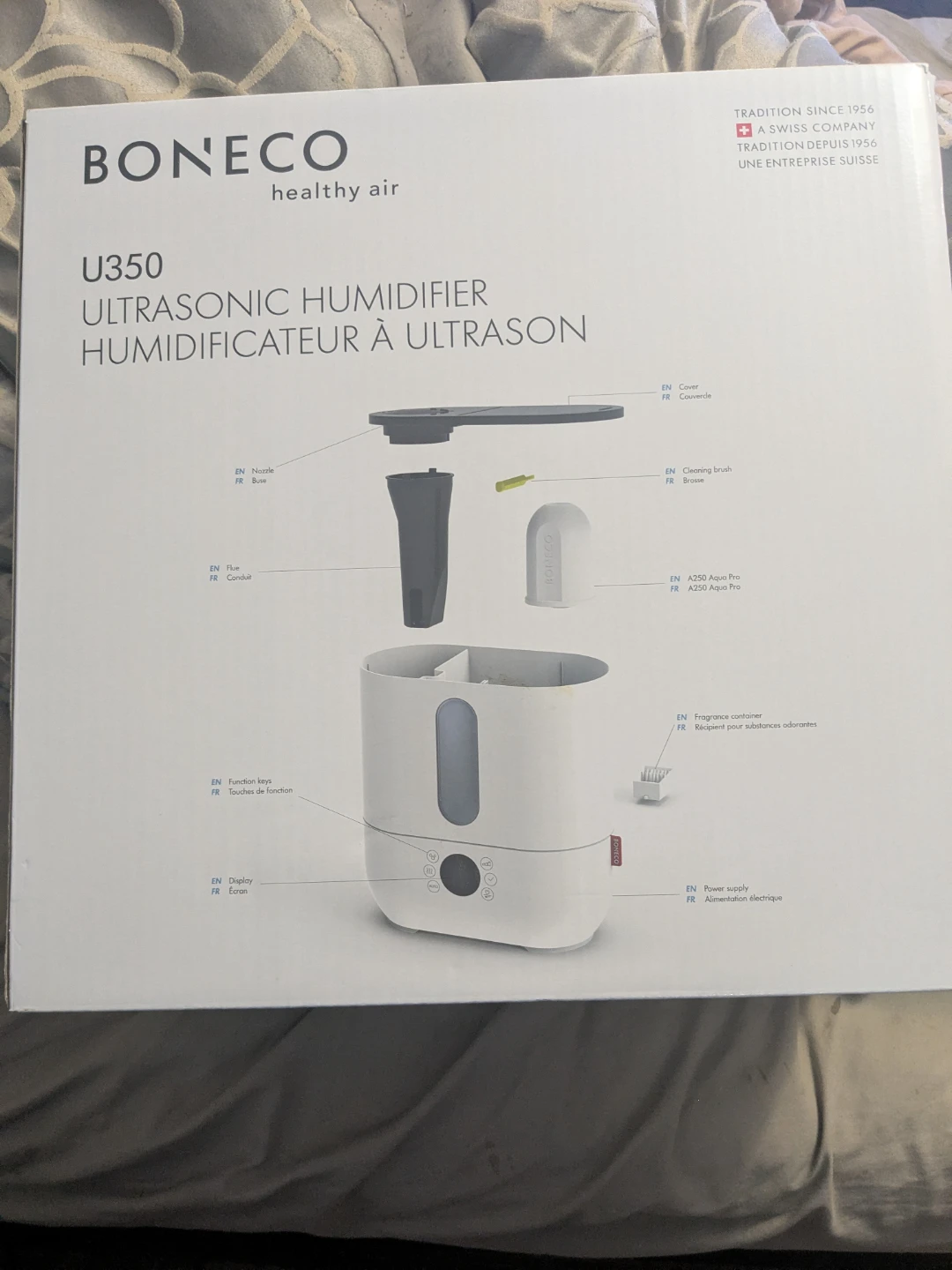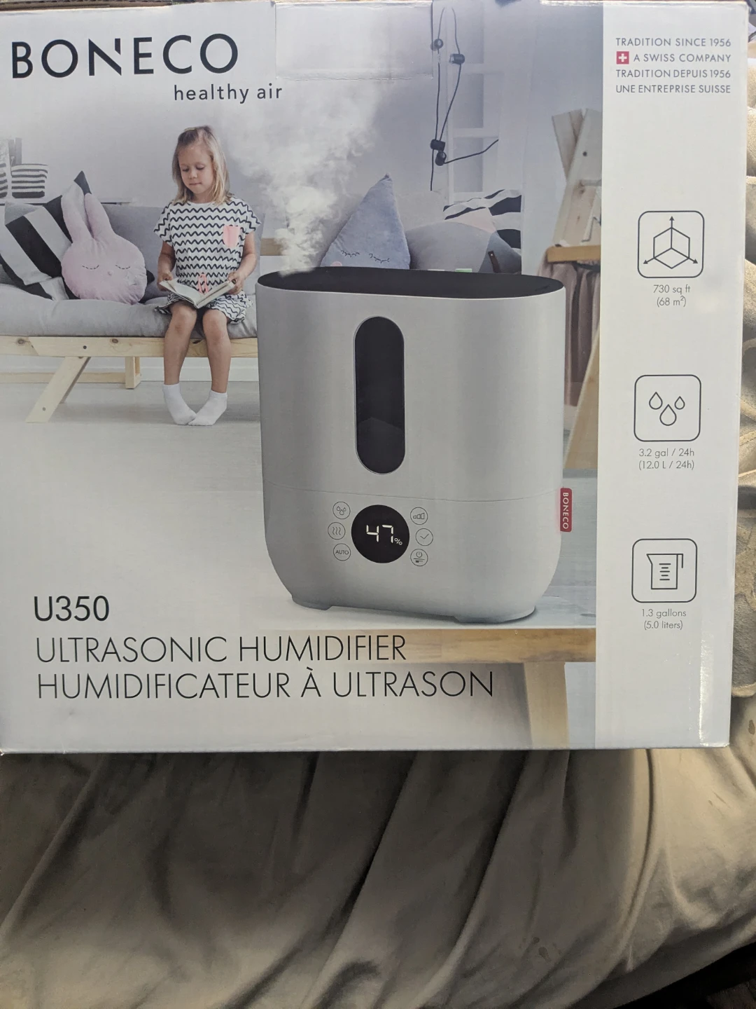 Selling a Boneco U350 Ultrasonic Humidifier. It can humidify up to 730 sq ft (68 m²). It can hold 1.3 gallons (5.0 liters) of water and runs for 24 hours. Comes with the box