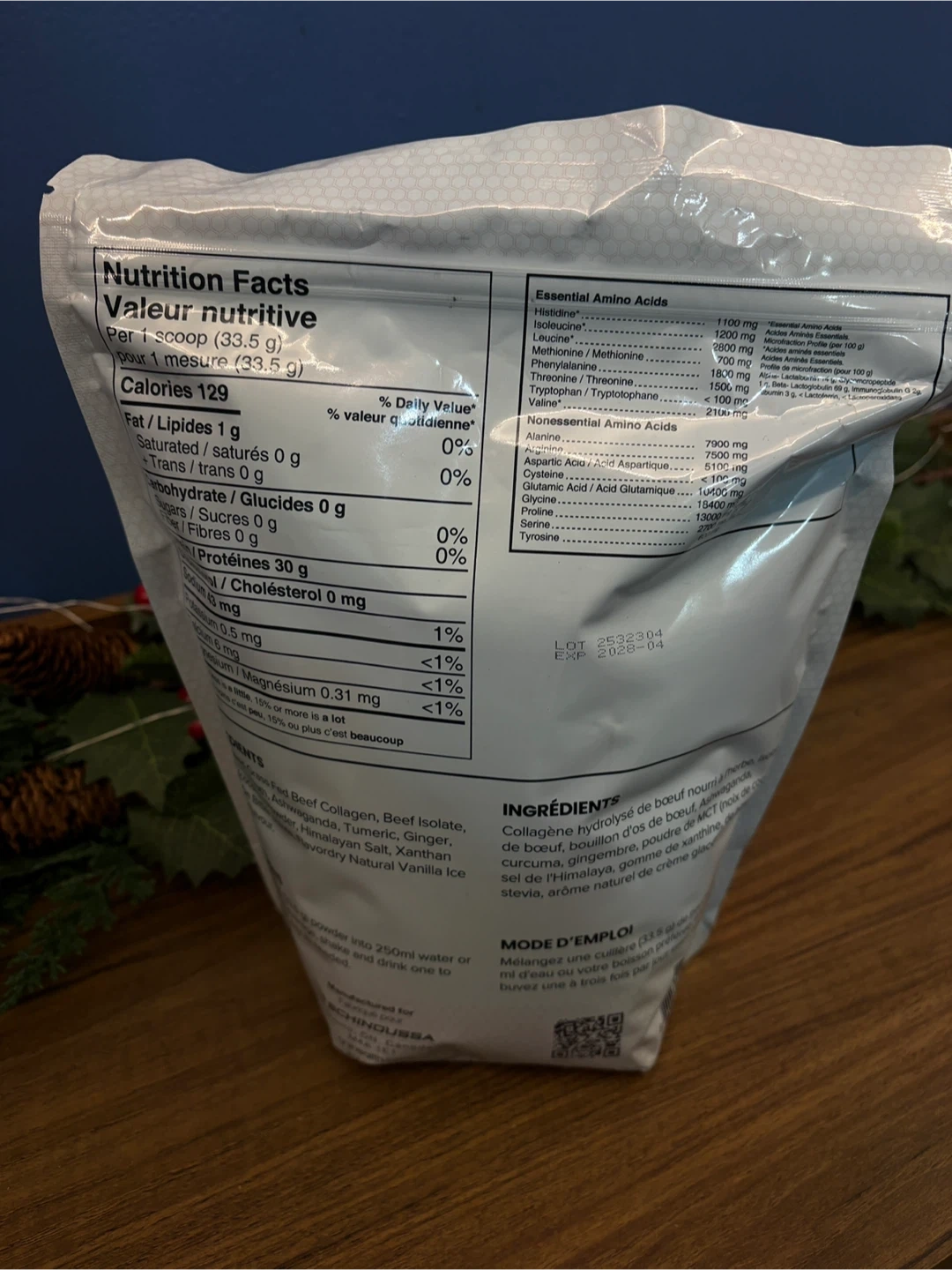 Selling a bag of Schinoussa Beef Protein in vanilla ice cream flavour. It's a triple strength protein from hydrolyzed grass fed beef collagen, beef isolate, and beef bone broth. Expiry date is 2028 April
