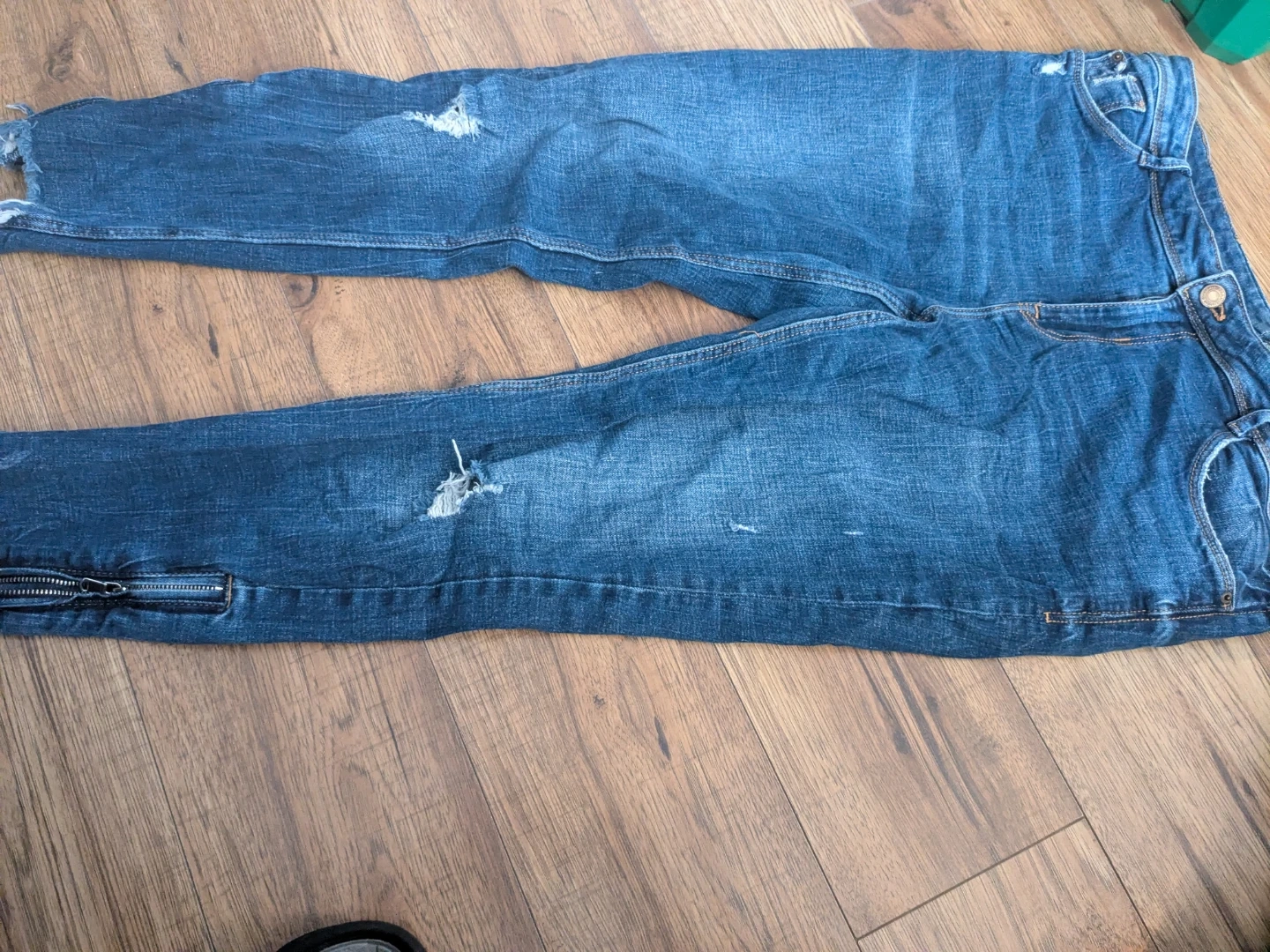 Selling a pair of Zara distressed denim jeans. They feature a stylish, worn look with some intentional rips and a unique zipper detail at the ankle. Perfect for a casual, edgy style!