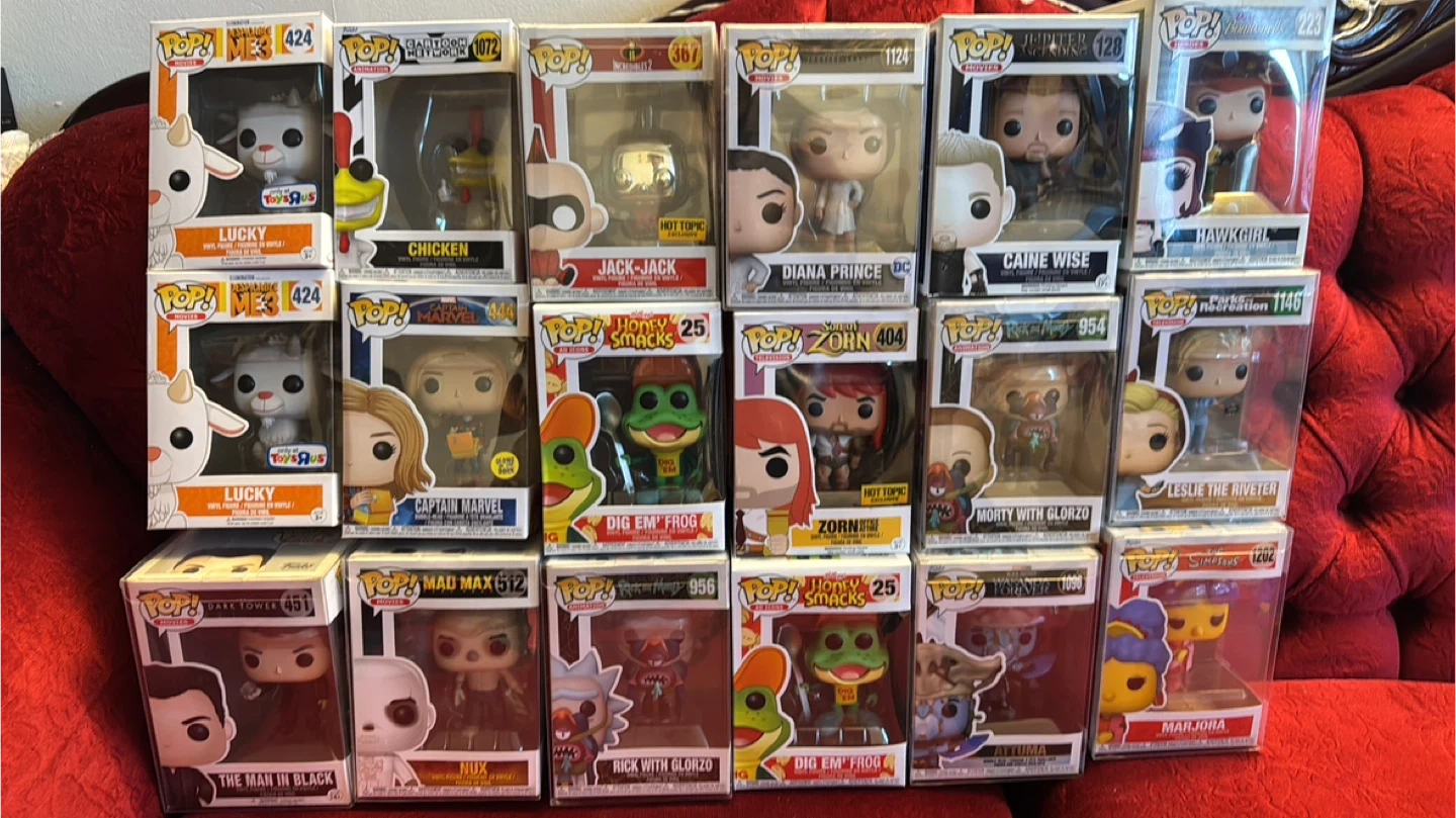Selling a variety of Funko Pop! figures. Each figure comes in its original box. Great for collectors or fans of these characters! Available figures include Lucky, Chicken, Jack-Jack, Diana Prince, Caine Wise, Hawk Girl, Leslie the Riveter, Morty with Glorzo, Zorn, Dig Em' Frog, Rick with Glorzo, Attuma, Marjora, The Man in Black, Nux, and Captain Marvel