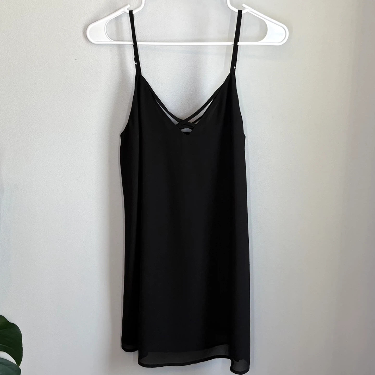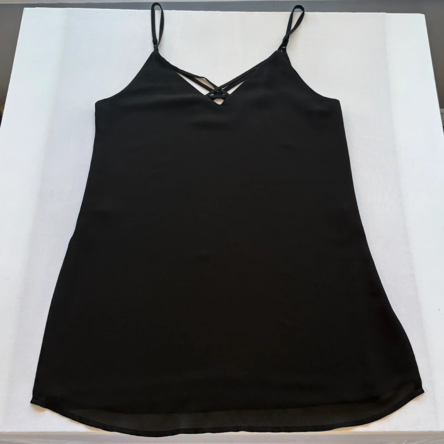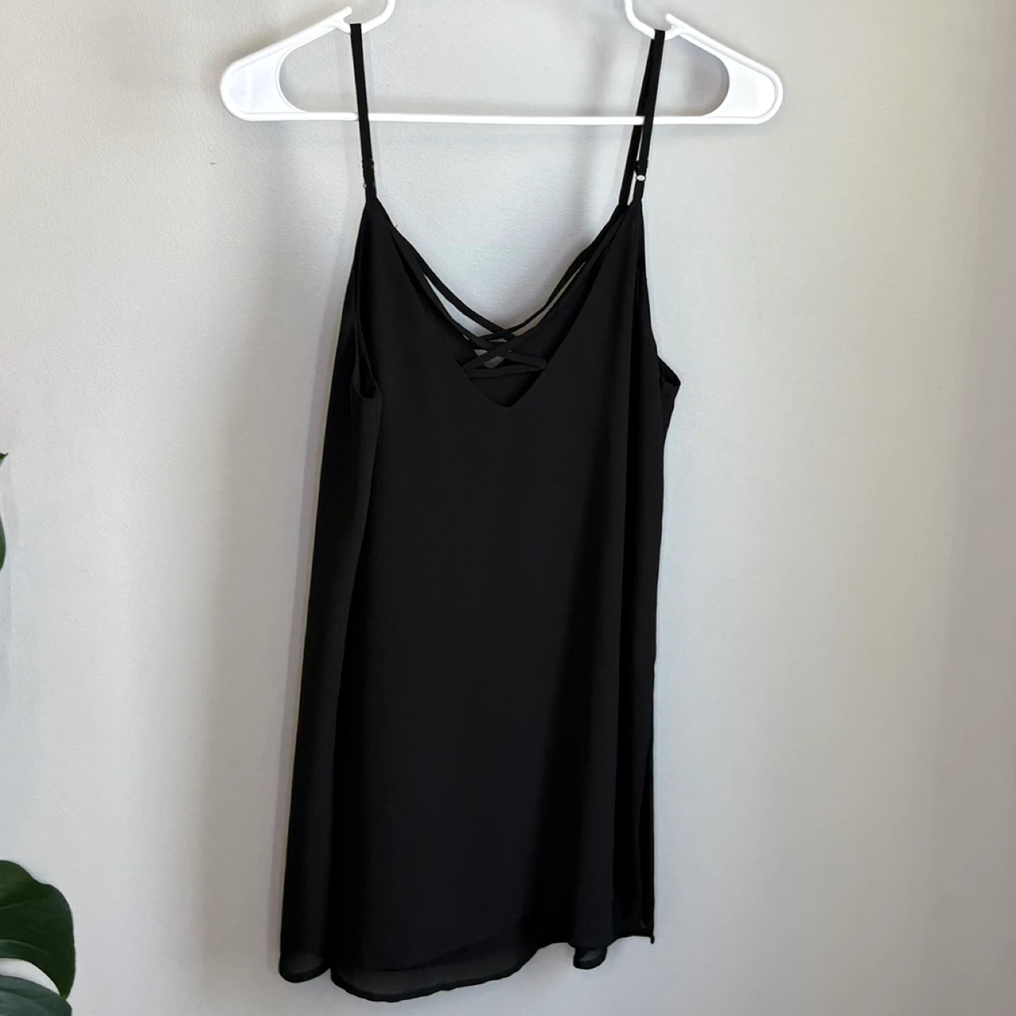 Elevate your wardrobe with this chic Naked Zebra camisole. This black top features a unique multi-strap crisscross detail on both the front and back necklines. The lightweight, double-layered design includes deep side slits starting halfway up the bodice for a flowy, modern silhouette. Perfect for layering or wearing on its own.