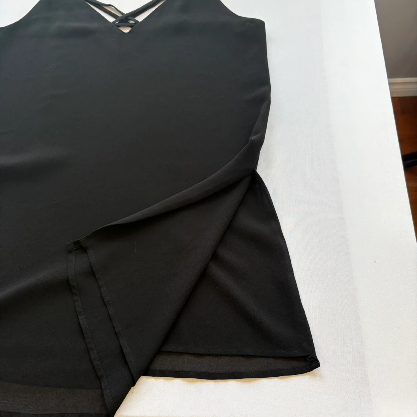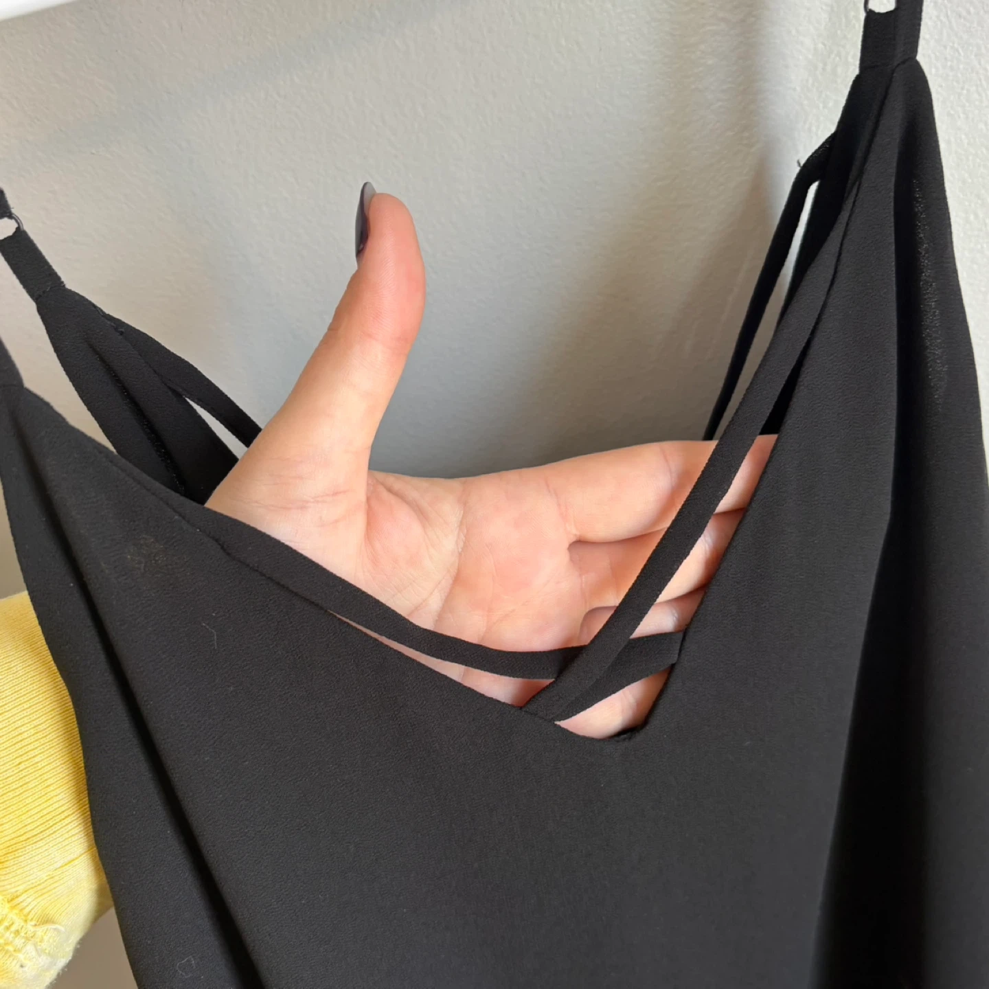 Naked Zebra, black camisole, strappy tank top, side slit top, double layered cami, crisscross neckline, minimalist style, summer top, evening wear, contemporary fashion