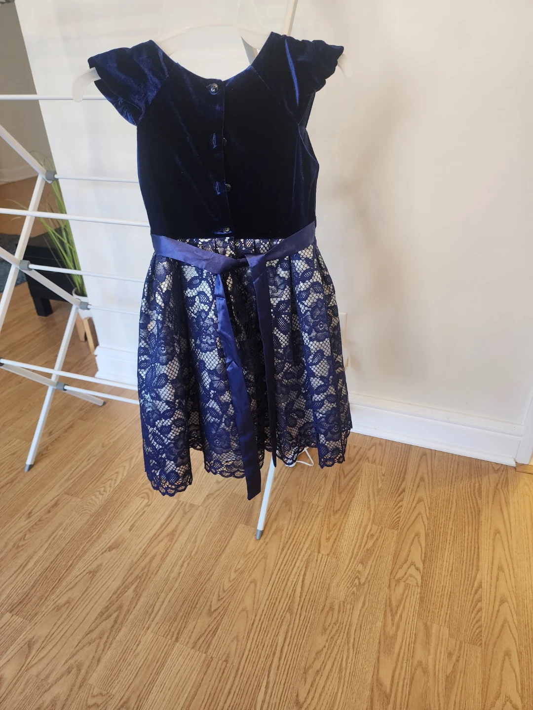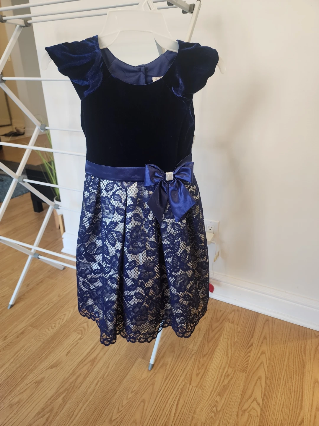 A beautiful girls' dress featuring a navy blue velvet top and a lace skirt. The dress has a ribbon belt with a decorative bow at the waist. Perfect for special occasions!