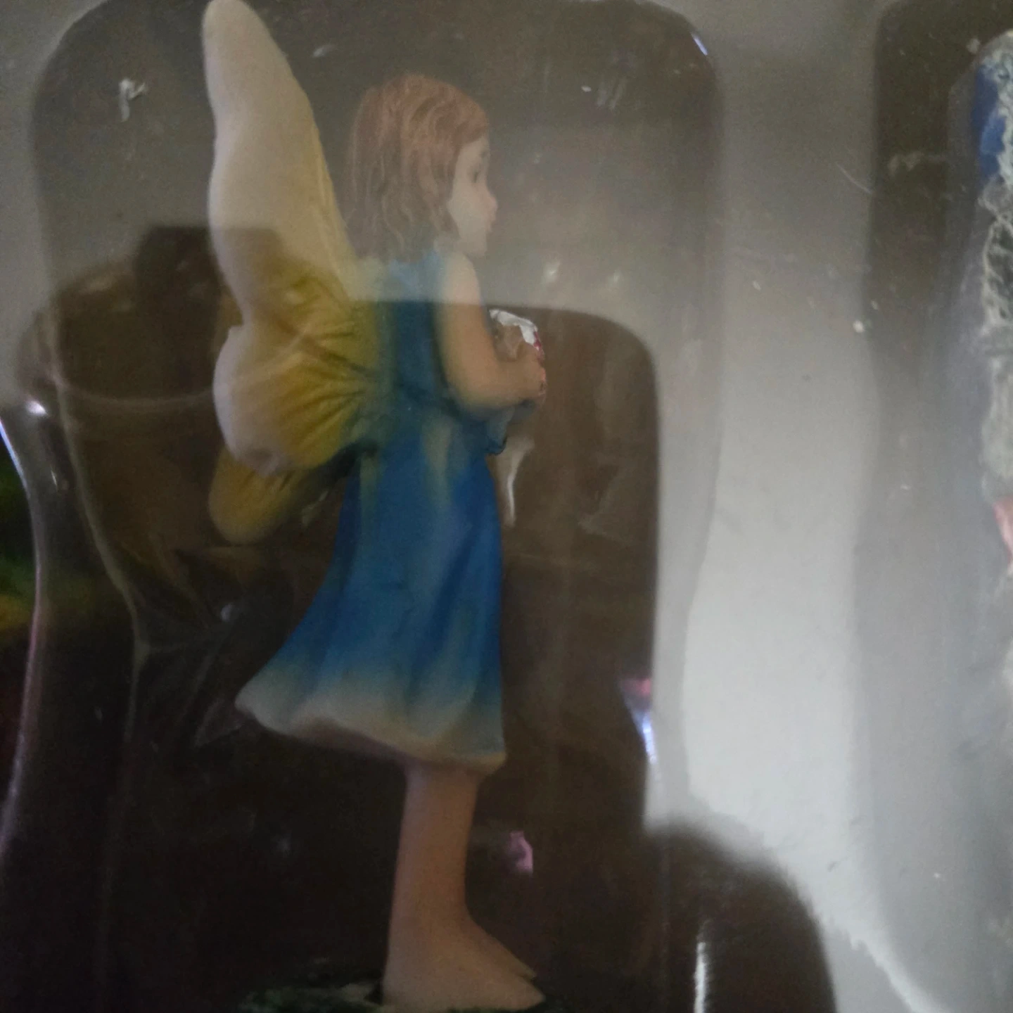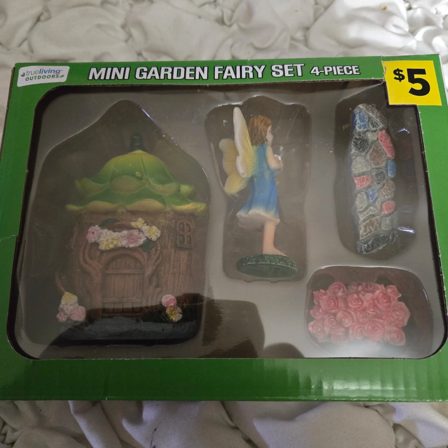 I'm selling a new Trueliving Outdoors mini garden fairy set! It's a 4-piece set with a fairy, a fairy house, a stone wall, and a rose bush. The original price tag says $5.