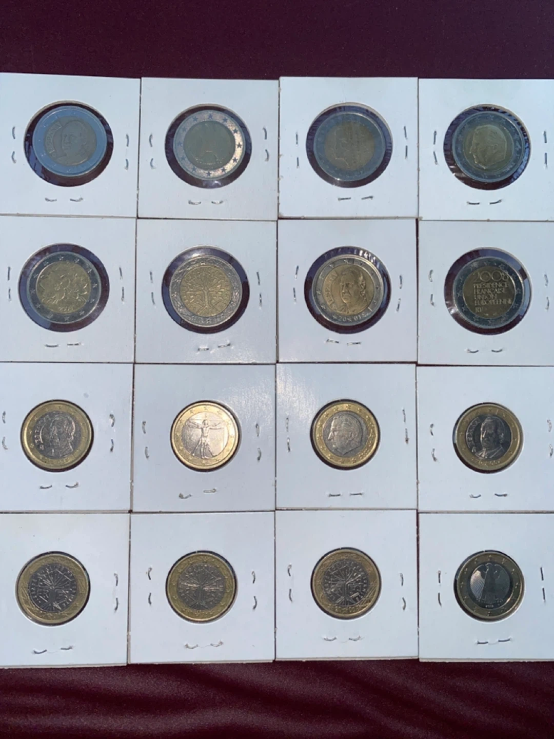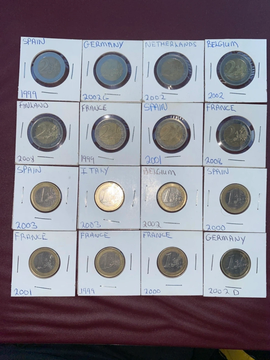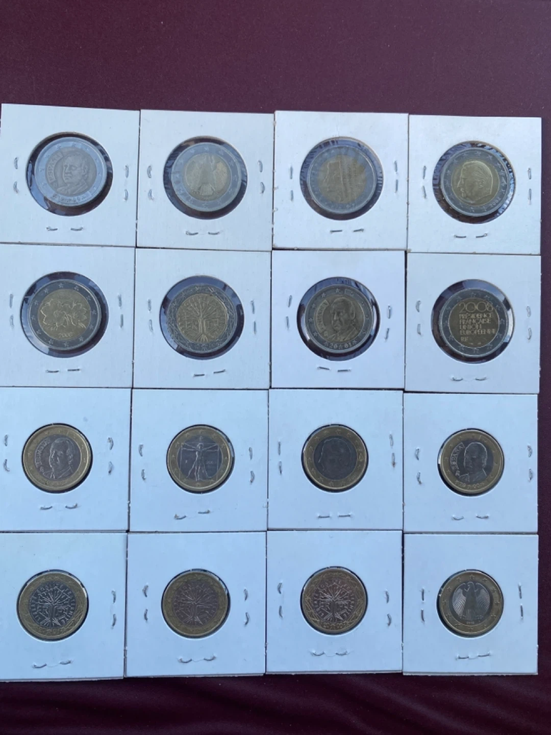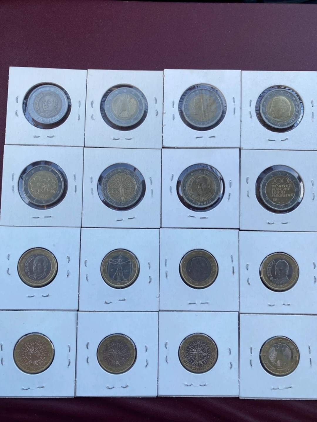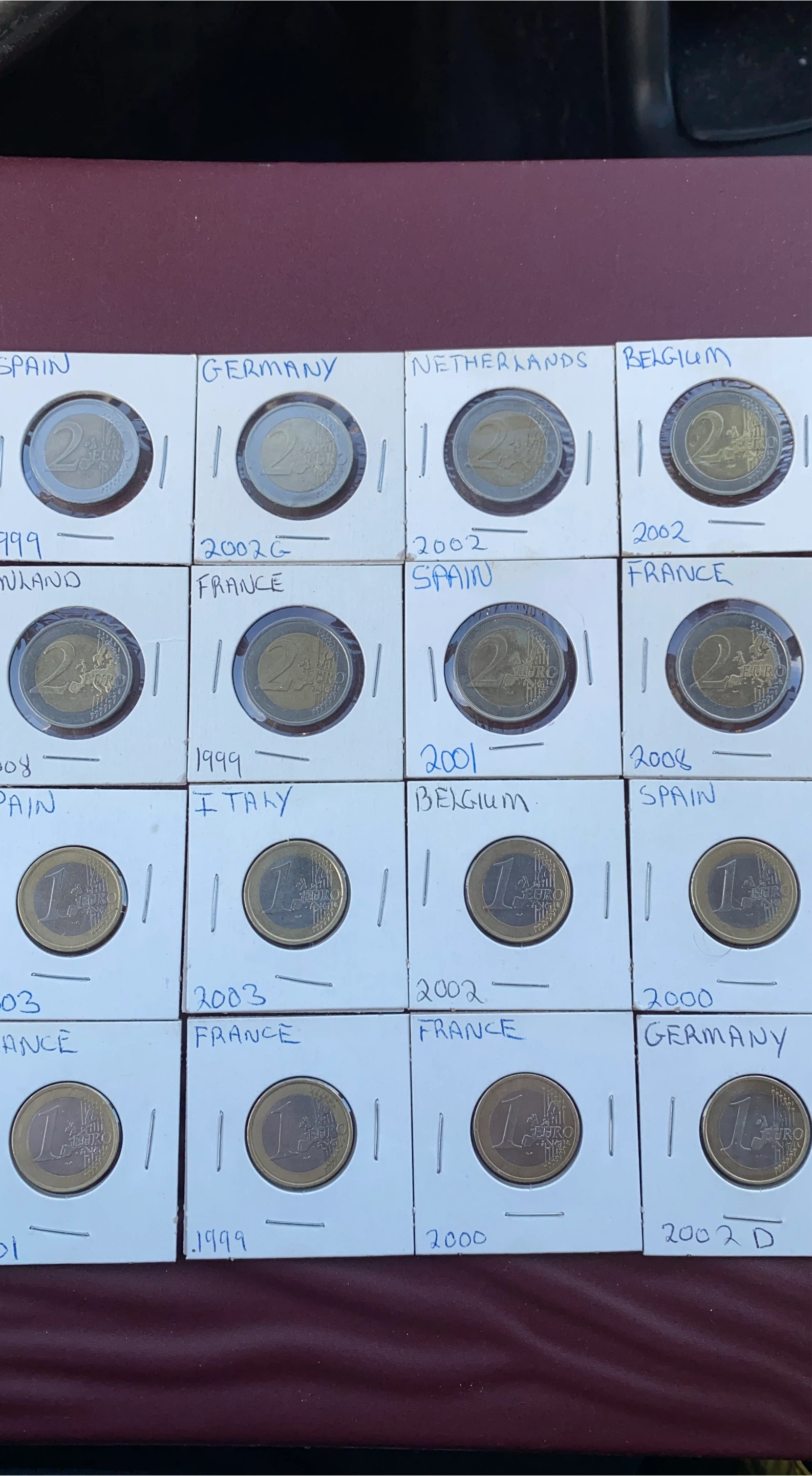 Selling a collection of European coins, including 1 and 2 Euro coins from various countries like Spain, Germany, Netherlands, Belgium, France, and Italy. The coins are from different years, ranging from 1999 to 2008. They're in individual holders, as you can see in the pictures