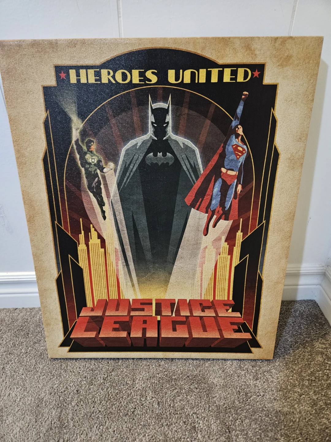 Here's a Heroes United Justice League canvas art piece! It features Batman, Superman, and Green Lantern in an Art Deco style. Perfect for any DC Comics fan!