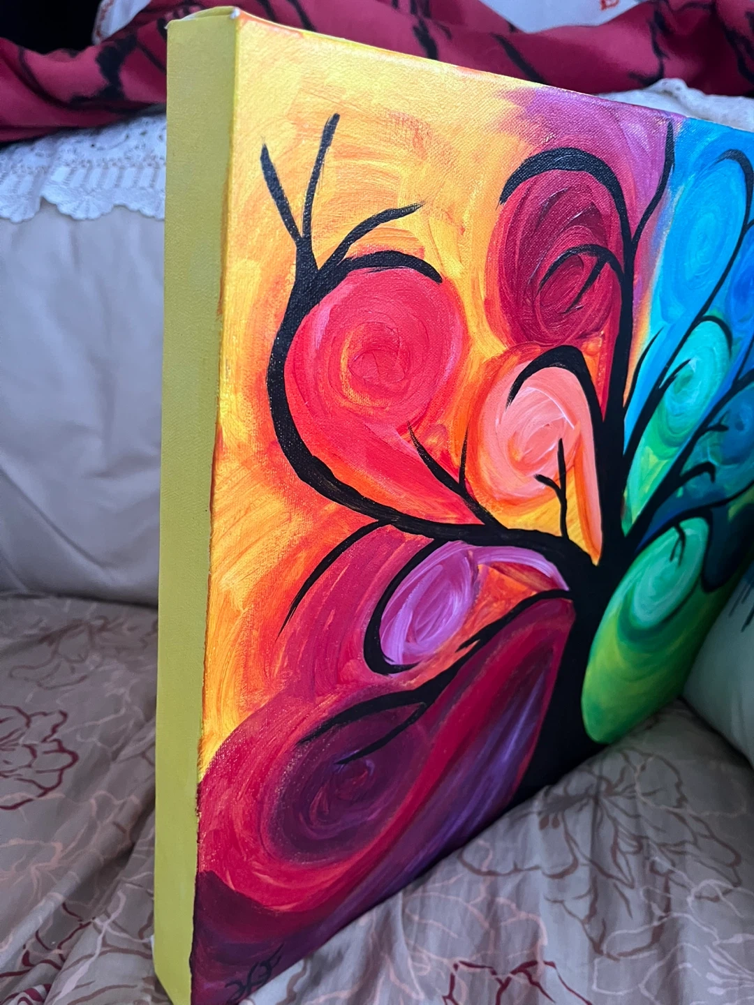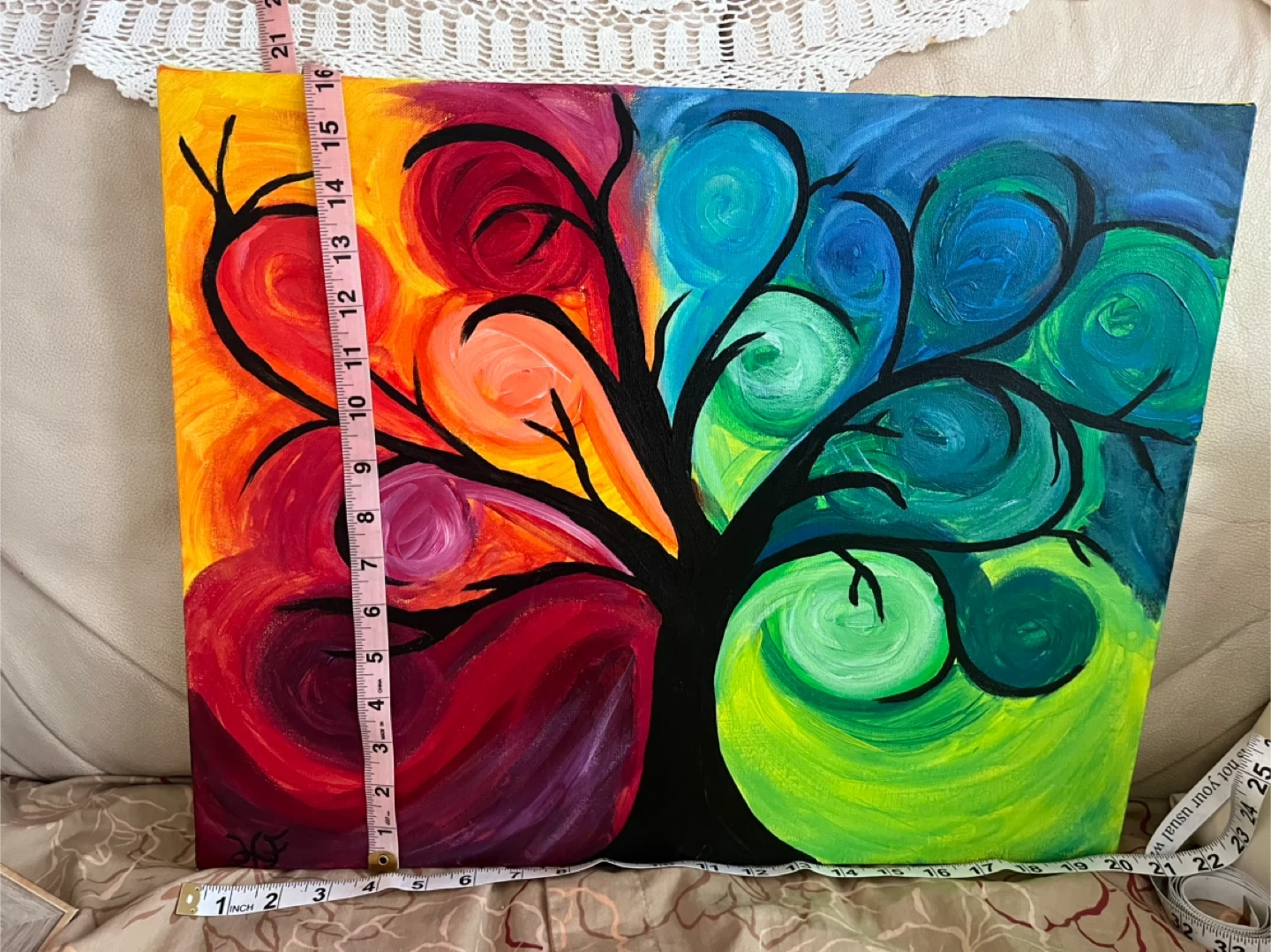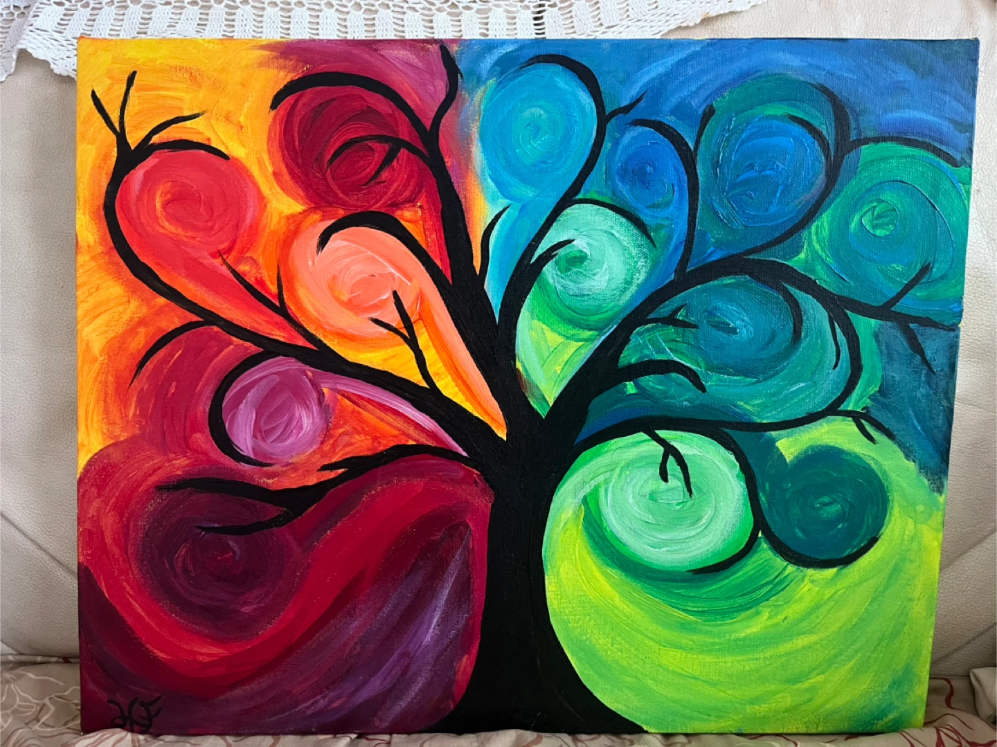 This is vibrant Tree of Life painting with colourful swirls, signed by the artist. It measures 16 inches by 20 inches on a 1.5 inch wide gallery canvas.