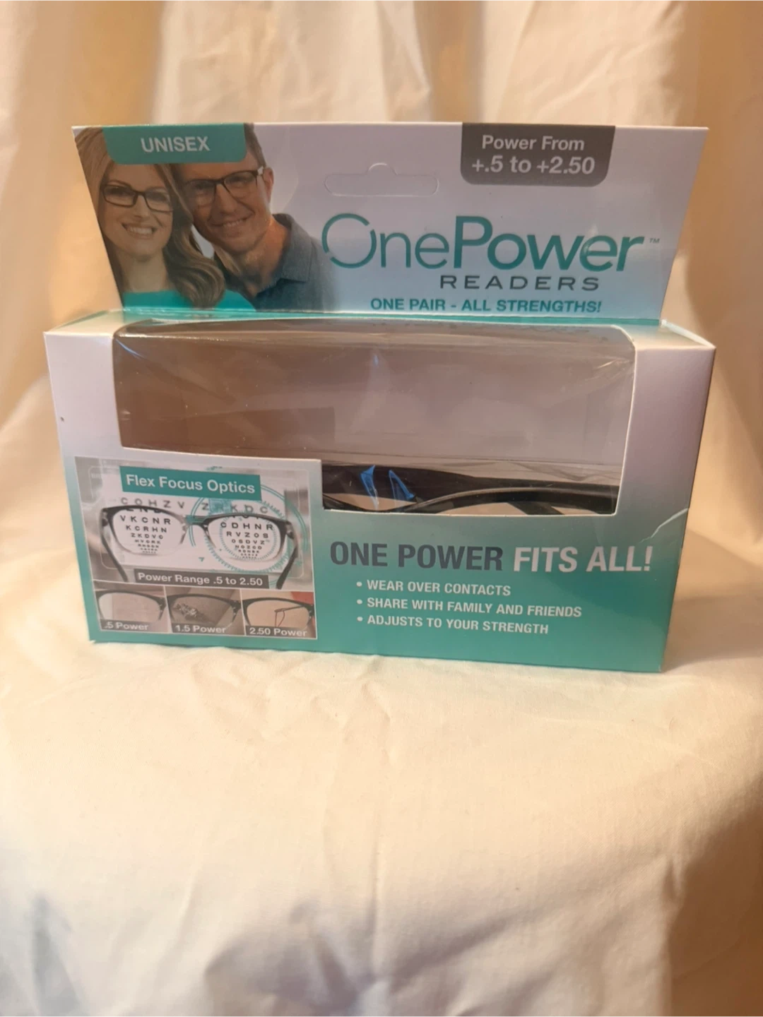 Selling a pair of One Power Readers, brand new in the box! These unisex readers are designed to adjust to your strength and can be worn over contacts. Perfect for sharing with family and friends. One pair fits all!