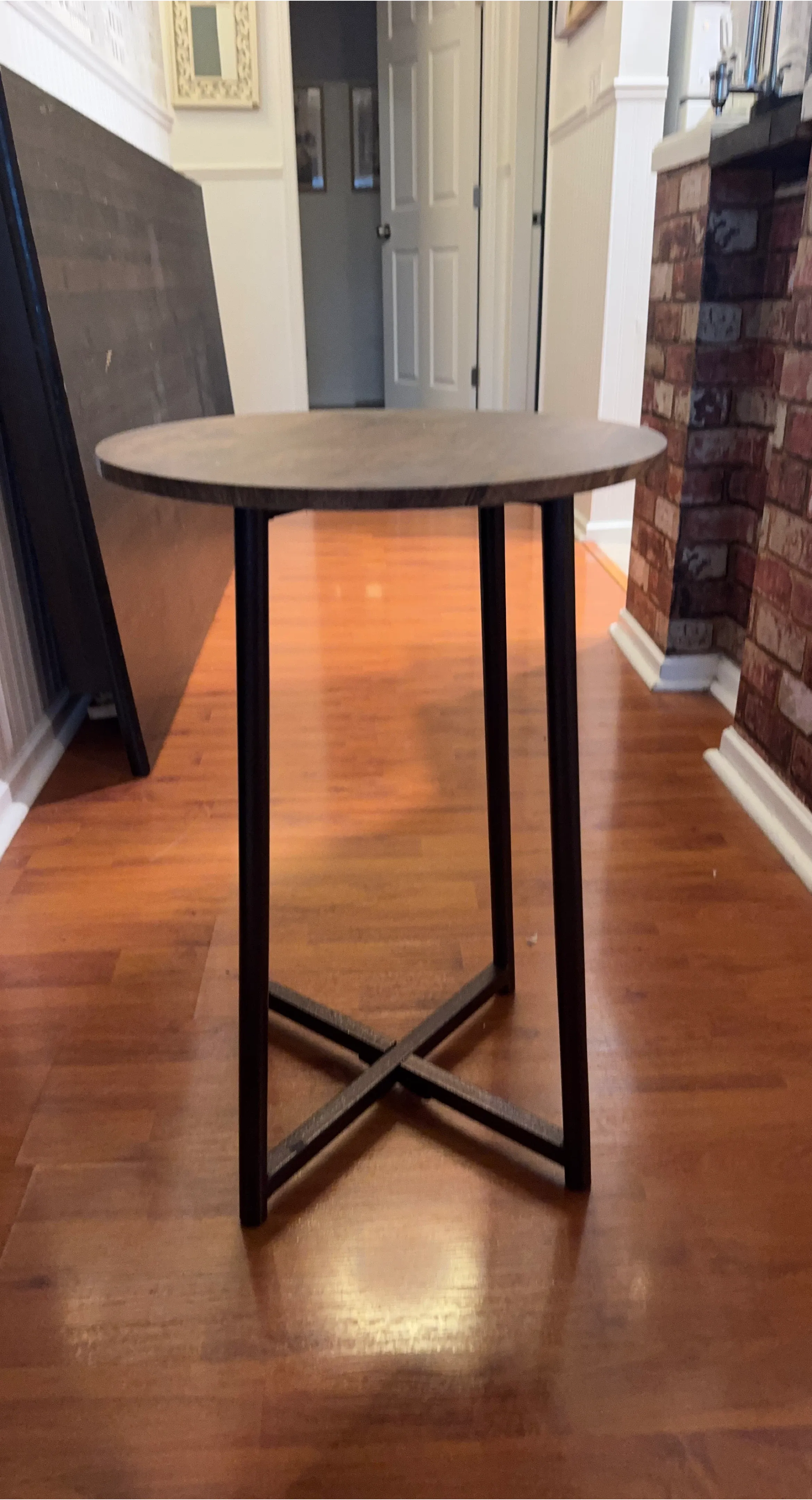 Here's a round side table with a brown top and dark legs. It's in good condition and would be a great addition to any living room or bedroom!
